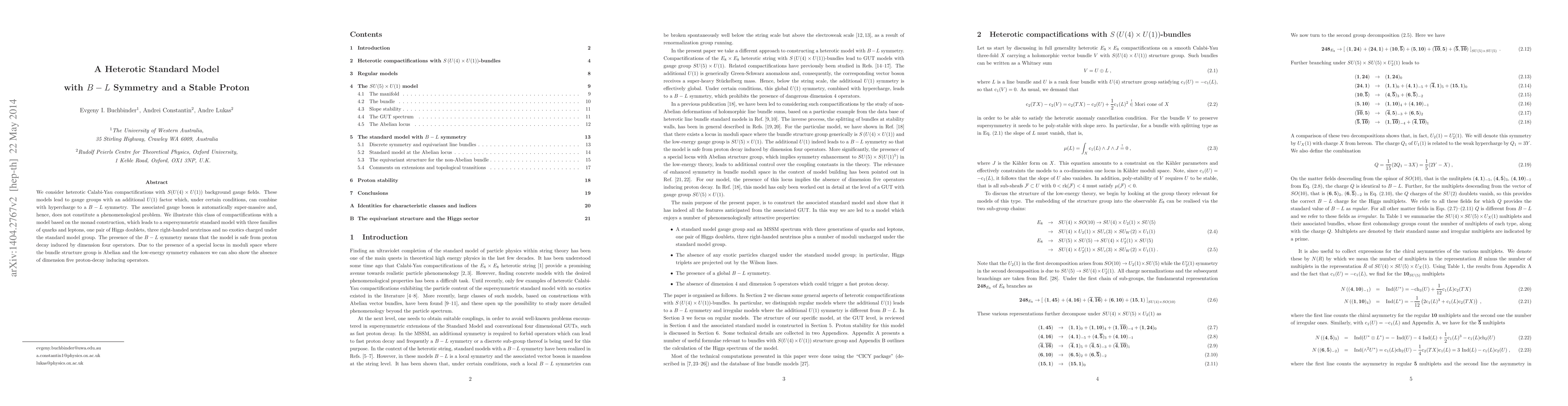 We consider heterotic Calabi-Yau compactifications with S(U(4)xU(1)) background gauge fields. These models lead to gauge groups with an additional U(1) factor which, under certain conditions, can combine with hypercharge to a B-L symmetry. The associated gauge boson is automatically super-massive and, hence, does not constitute a phenomenological problem. We illustrate this class of compactifications with a model based on the monad construction, which leads to a supersymmetric standard model with three families of quarks and leptons, one pair of Higgs doublets, three right-handed neutrinos and no exotics charged under the standard model group. The presence of the B-L symmetry means that the model is safe from proton decay induced by dimension four operators. Due to the presence of a special locus in moduli space where the bundle structure group is Abelian and the low-energy symmetry enhances we can also show the absence of dimension five proton-decay inducing operators.