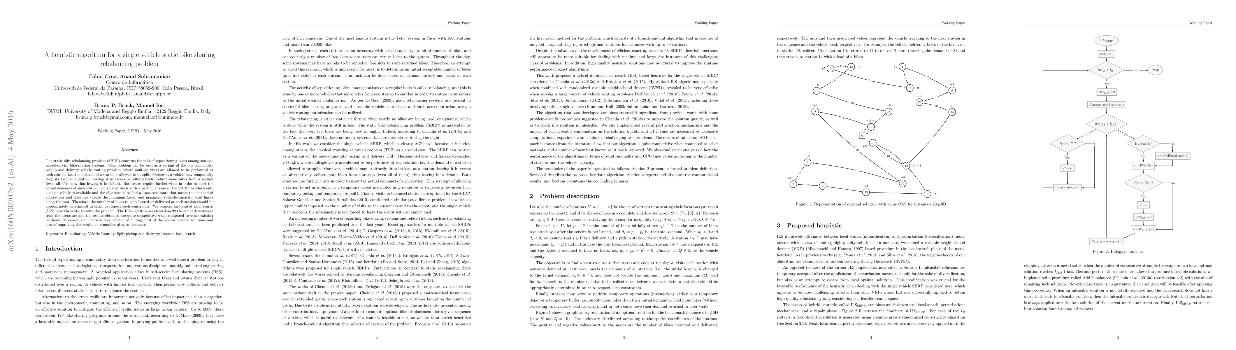 This paper proposes an iterated local search (ILS) heuristic to solve the single vehicle static bike rebalancing problem (SBRP), aiming to find a least-cost route that meets station demands while respecting load limits. The ILS algorithm was tested on 980 benchmark instances, showing competitive results and often finding known optimal solutions.