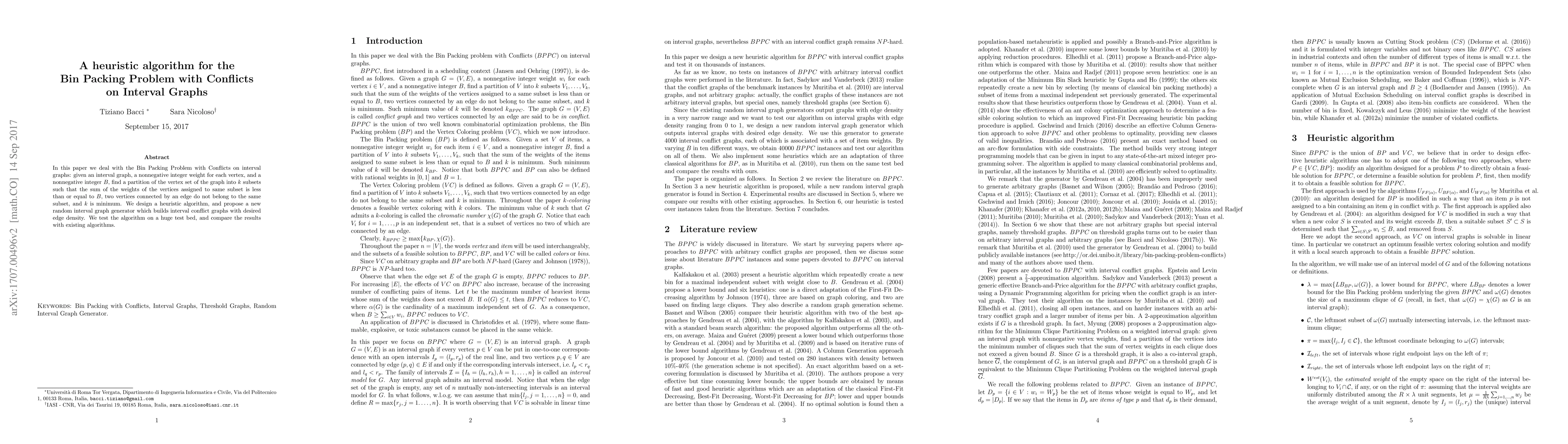This paper presents a heuristic algorithm for the Bin Packing Problem with Conflicts on interval graphs, aiming to minimize the number of subsets while ensuring connected vertices do not share a subset. The authors also introduce a new random interval graph generator and test their algorithm against existing methods on extensive test data.