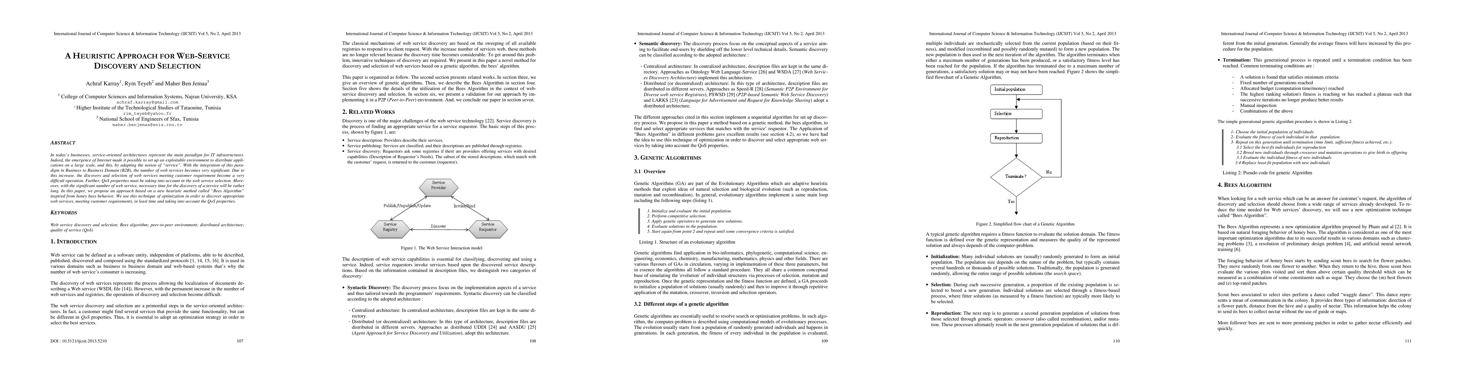 This paper proposes a heuristic method called "Bees Algorithm" inspired by honey bees' behavior to efficiently discover and select web services that meet customer requirements while considering QoS properties, aiming to reduce the time needed for service discovery in a service-oriented architecture.