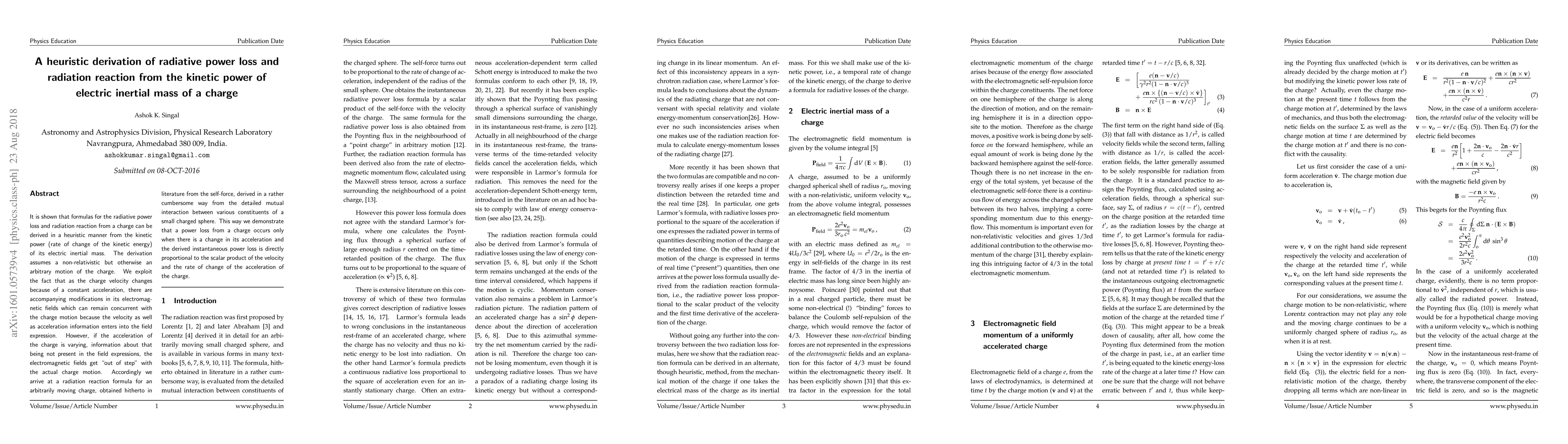 This paper heuristically derives formulas for radiative power loss and radiation reaction from a charge's kinetic power of electric inertial mass, showing that power loss occurs only when acceleration changes, proportional to the scalar product of velocity and acceleration change. Traditional methods derive these from complex mutual interactions within charged spheres.