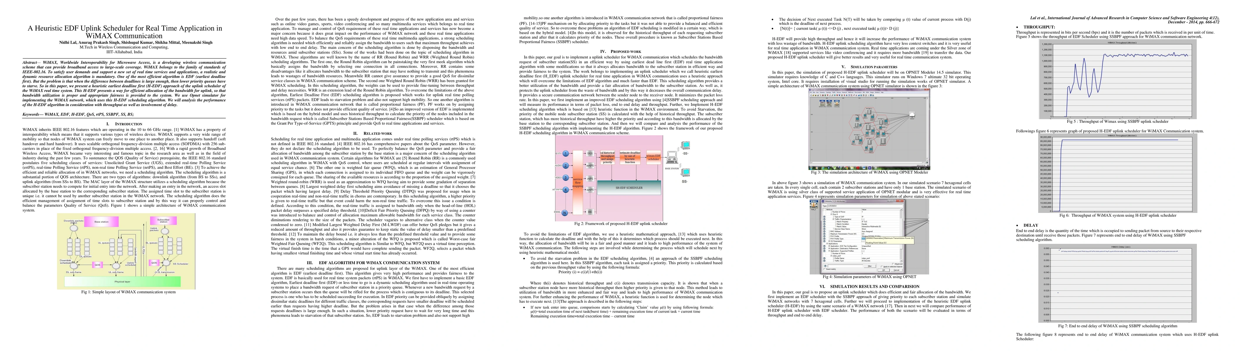 This paper proposes a heuristic EDF uplink scheduler for WiMAX to efficiently allocate bandwidth for real-time applications, addressing the issue of lower priority queues starving in traditional EDF. The H-EDF algorithm aims to optimize bandwidth utilization and fairness, analyzed using Opnet simulator for performance metrics like throughput and delay.