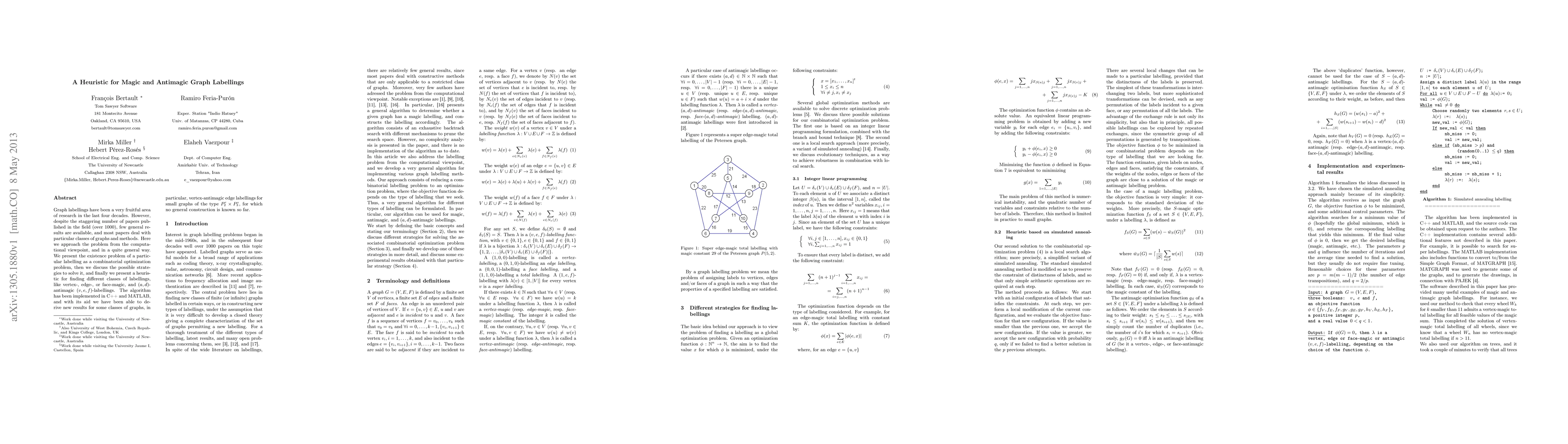 The paper presents a heuristic algorithm based on simulated annealing for finding various classes of graph labellings, along with an implementation in C++ and MATLAB.