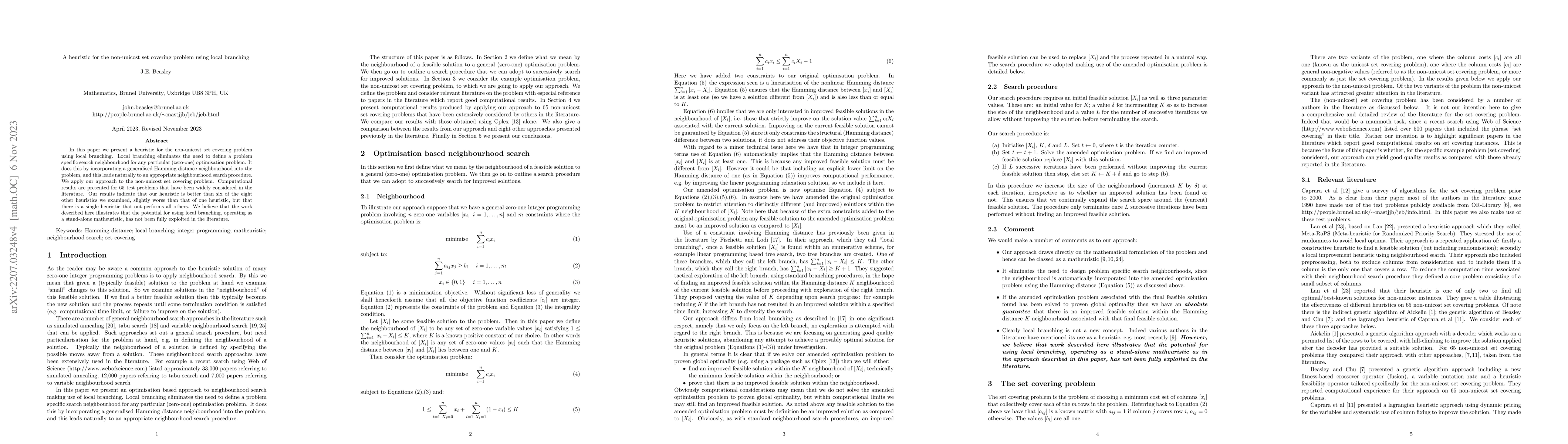This paper introduces a heuristic for the non-unicost set covering problem using local branching, which simplifies the search neighbourhood definition. The approach outperforms six of eight compared heuristics, indicating the underutilization of local branching as a standalone optimization method.