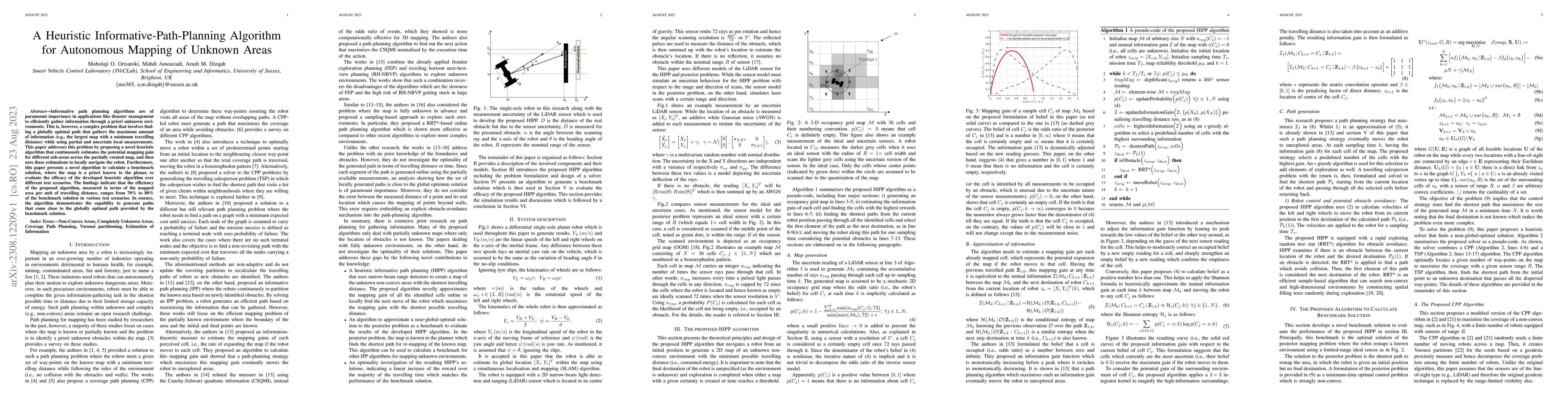 This paper proposes a heuristic algorithm for autonomous mapping in unknown areas, optimizing path planning to maximize information gain while minimizing travel distance. The algorithm's performance, evaluated against a benchmark solution, shows it achieves 70-80% of the optimal mapped area per unit distance.