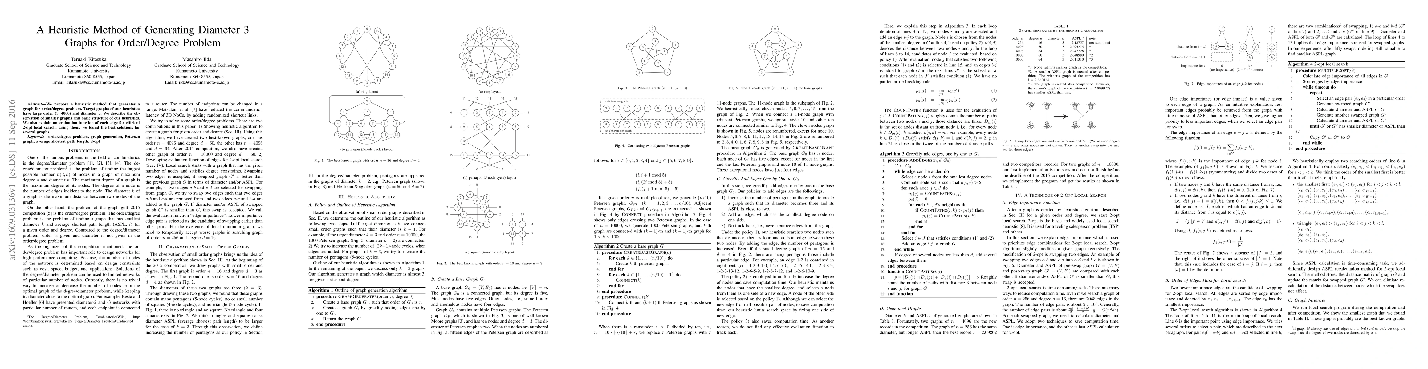 We propose a heuristic method that generates a graph for order/degree problem. Target graphs of our heuristics have large order (> 4000) and diameter 3. We describe the ob- servation of smaller graphs and basic structure of our heuristics. We also explain an evaluation function of each edge for efficient 2-opt local search. Using them, we found the best solutions for several graphs.