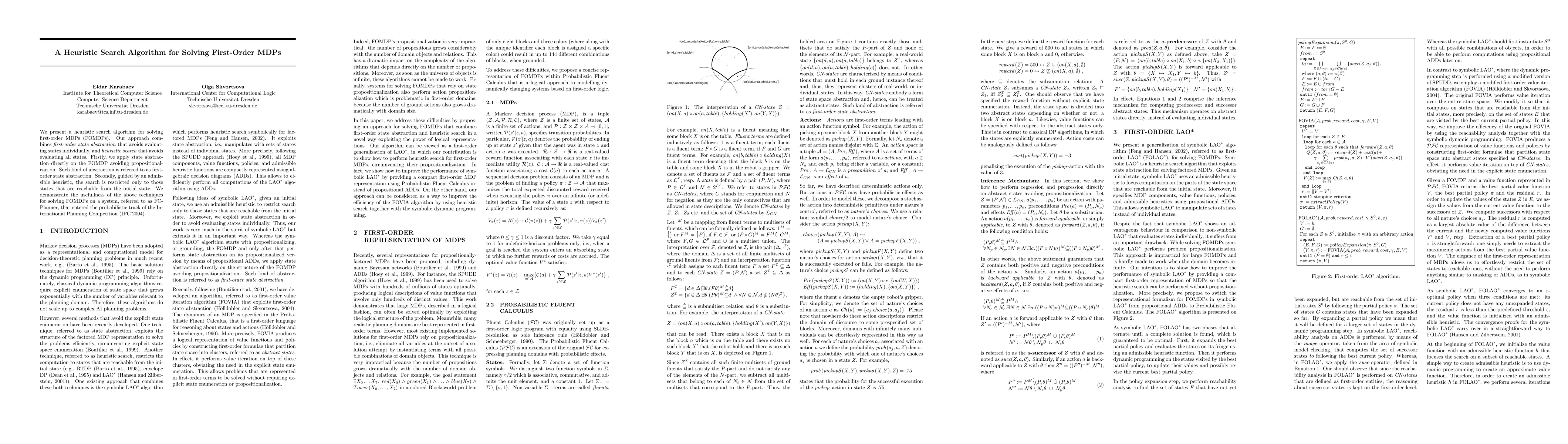 We present a heuristic search algorithm for solving first-order MDPs (FOMDPs). Our approach combines first-order state abstraction that avoids evaluating states individually, and heuristic search that avoids evaluating all states. Firstly, we apply state abstraction directly on the FOMDP avoiding propositionalization. Such kind of abstraction is referred to as firstorder state abstraction. Secondly, guided by an admissible heuristic, the search is restricted only to those states that are reachable from the initial state. We demonstrate the usefullness of the above techniques for solving FOMDPs on a system, referred to as FCPlanner, that entered the probabilistic track of the International Planning Competition (IPC'2004).
