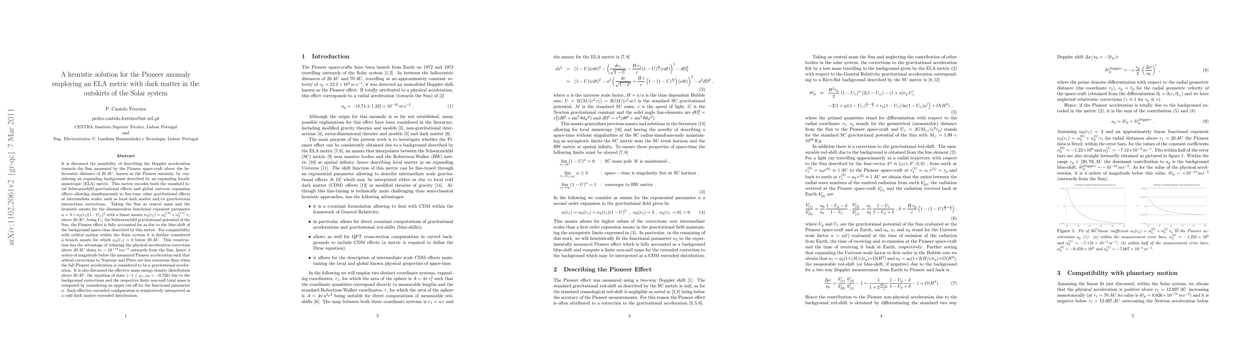 Considering an expanding locally anisotropic (ELA) metric with the Sun as central mass and the heuristic ansatz for the dimensionless functional exponent parameter 'alpha=3+alpha_2(r_1)(1-U_Sun)^2' with a linear ansatz 'alpha_2(r_1)=alpha_2^(2.0)+alpha_2^(2.1) r_1' above 20 AU the pioneer anomaly is fully accounted for as due to the blue-shift of the background space-time. For compatibility with orbital motion within the Solar system it is further considered a branch ansatz for which \alpha_2(r_1)=0 below 20 AU. This construction reduces the physical acceleration correction above 20 AU down to ~10^(-14) m/s^2 outwards from the Sun such that orbital corrections to Neptune and Pluto are less notorious than when the full Pioneer acceleration is considered to be a gravitational acceleration. It is also discussed the effective mass-energy density distribution above 20 AU due to the background corrections, the respective equation of state ('-1 < w < -0.726') and the finite non-null total mass is computed by considering an upper cut-off for the functional parameter 'alpha'. Such effective extended configuration is tentatively interpreted as a cold dark matter distribution.