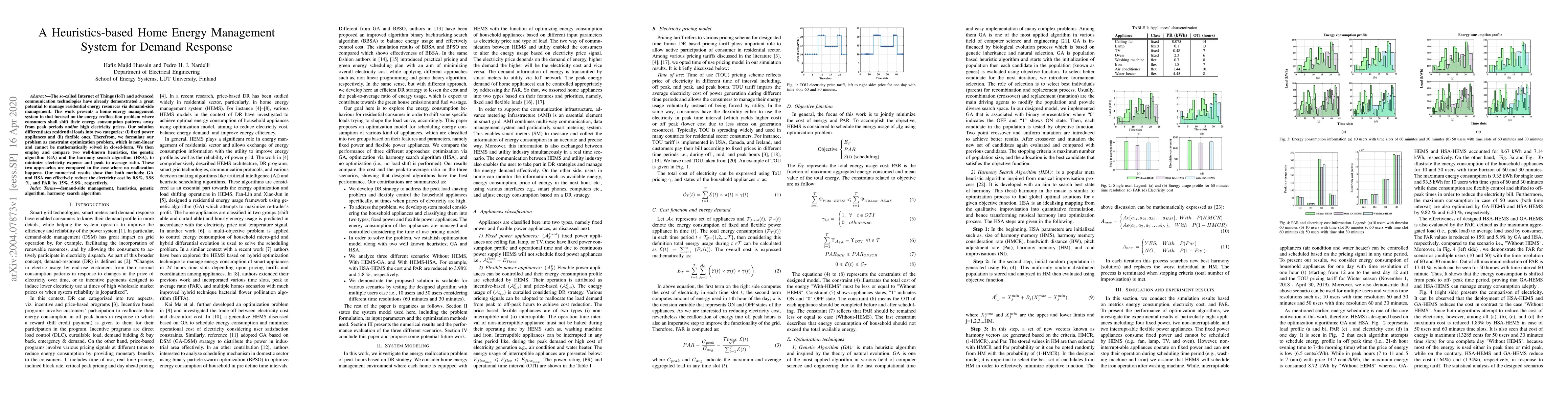 The so-called Internet of Things (IoT) and advanced communication technologies have already demonstrated a great potential to manage residential energy resources via demand-side management. This work presents a home energy management system in that focused on the energy reallocation problem where consumers shall shift their energy consumption patterns away from peak periods and/or high electricity prices. Our solution differentiates residential loads into two categories: (i) fixed power appliances and (ii) flexible ones. Therefrom, we formulate our problem as a constraint optimization problem, which is non-linear and cannot be mathematically solved in closed-form. We then employ and compare two well-known heuristics, the genetic algorithm (GA) and the harmony search algorithm (HSA), to minimize electricity expense and peak to average ratio. These two approaches are compared to the case where no reallocation happens. Our numerical results show that both methods; GAand HSA can effectively reduce the electricity cost by 0.9%, 3.98%, and PAR by 15%, 5.8%, respectively