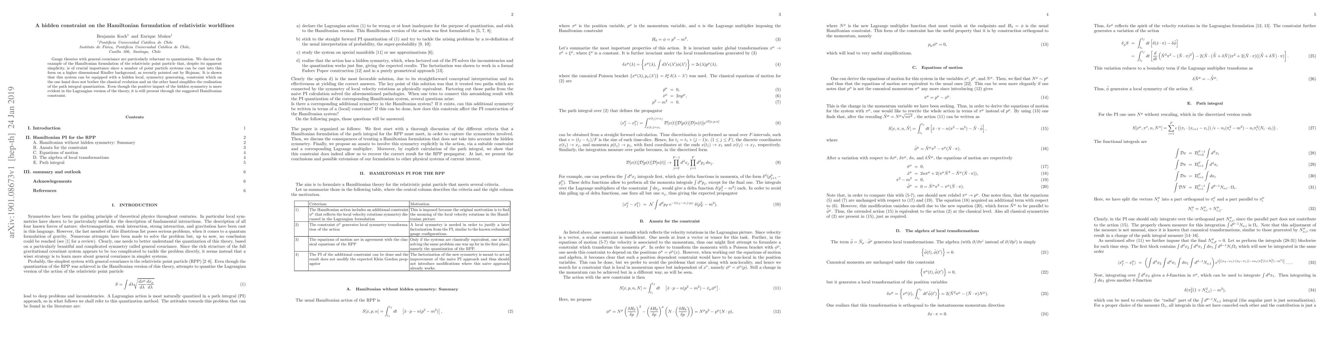 Gauge theories with general covariance are particularly reluctant to quantization. We discuss the example of the Hamiltonian formulation of the relativistic point particle that, despite its apparent simplicity, is of crucial importance since a number of point particle systems can be cast into this form on a higher dimensional Rindler background, as recently pointed out by Hojman. It is shown that this system can be equipped with a hidden local, symmetry generating, constraint which on the one hand does not bother the classical evolution and on the other hand simplifies the realization of the path integral quantization. Even though the positive impact of the hidden symmetry is more evident in the Lagrangian version of the theory, it is still present through the suggested Hamiltonian constraint.