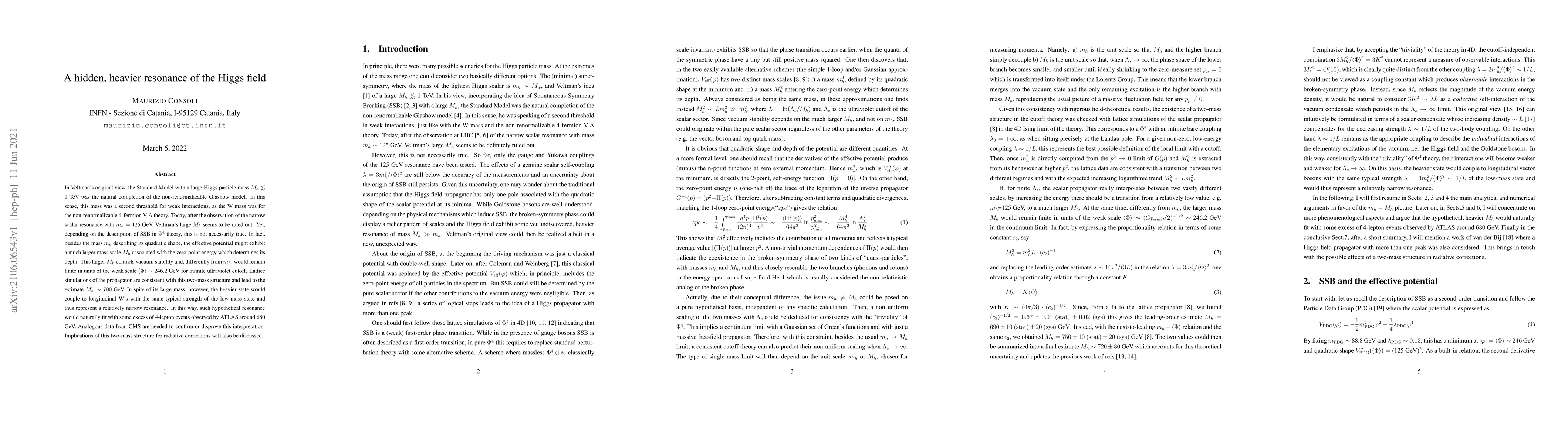In Veltman's original view, the Standard Model with a large Higgs particle mass of about 1 TeV was the natural completion of non-renormalizable Glashow model. This mass was thus a second threshold for weak interactions, as the W mass was for the non-renormalizable 4-fermion V-A theory. Today, after the observation of the narrow scalar resonance at 125 GeV, Veltman's large-mass idea seems to be ruled out. Yet, this is not necessarily true. Depending on the description of SSB in $\Phi^4$ theory, and by combining analytic calculations and lattice simulations, besides the known particle at 125 GeV, a new resonance of the Higgs field may also show up around 700 GeV. The peculiarity, though, is that this heavier state would couple to longitudinal vector bosons with the same typical strength of the low-mass state and thus represent a relatively narrow resonance. In this way, such hypothetical new resonance would naturally fit with some excess of 4-lepton events observed by ATLAS around 680 GeV. Analogous data from CMS are needed to confirm or disprove this interpretation. Implications of a two-mass structure for radiative corrections are also discussed.