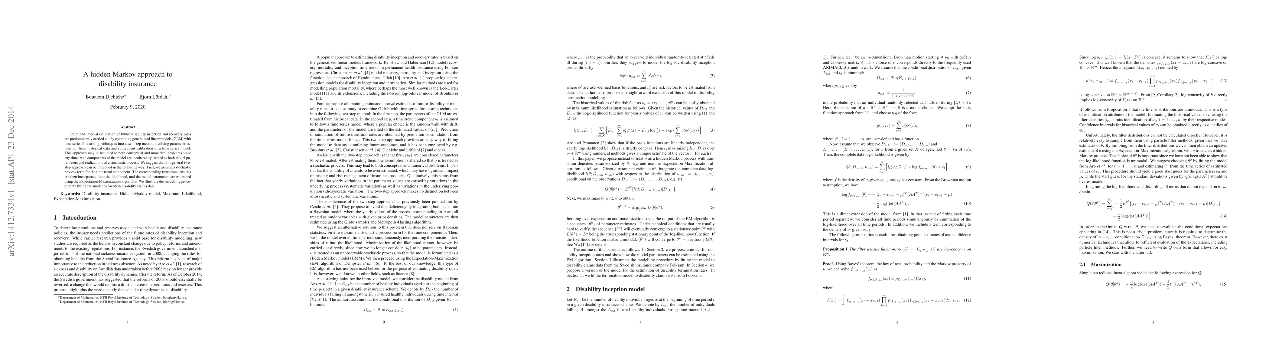 Point and interval estimation of future disability inception and recovery rates are predominantly carried out by combining generalized linear models (GLM) with time series forecasting techniques into a two-step method involving parameter estimation from historical data and subsequent calibration of a time series model. This approach may in fact lead to both conceptual and numerical problems since any time trend components of the model are incoherently treated as both model parameters and realizations of a stochastic process. We suggest that this general two-step approach can be improved in the following way: First, we assume a stochastic process form for the time trend component. The corresponding transition densities are then incorporated into the likelihood, and the model parameters are estimated using the Expectation-Maximization algorithm. We illustrate the modelling procedure by fitting the model to Swedish disability claims data.