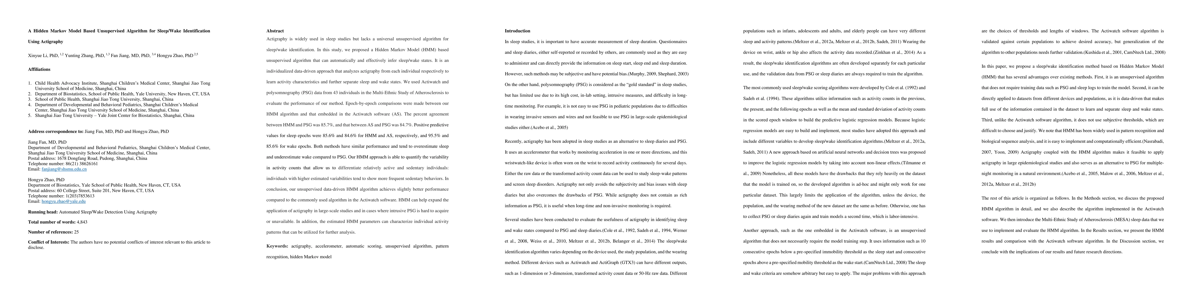 This study proposes a Hidden Markov Model (HMM) based unsupervised algorithm for identifying sleep/wake states using actigraphy, achieving 85.7% agreement with polysomnography (PSG). The HMM method slightly outperforms the Actiwatch software's algorithm, and it can characterize individual activity patterns, potentially expanding actigraphy's application in large-scale studies.