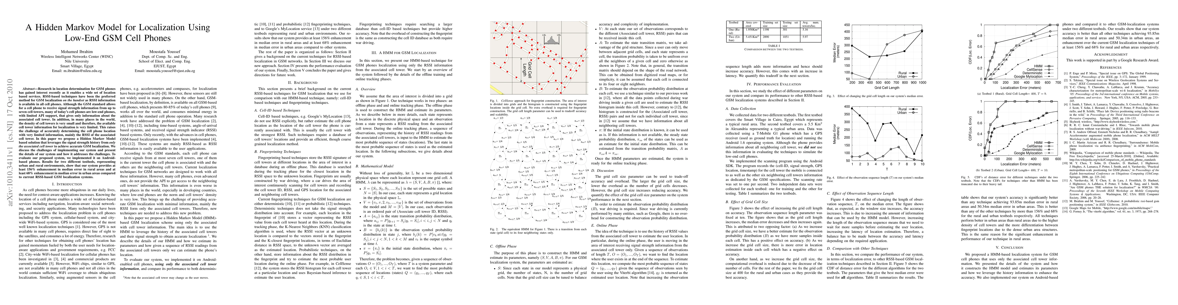 This paper proposes a Hidden Markov Model for GSM localization using low-end cell phones with limited API support, focusing on signal strength information from a single associated cell tower. The model significantly improves localization accuracy in both urban and rural environments, achieving at least 156% and 68% reductions in median error, respectively.