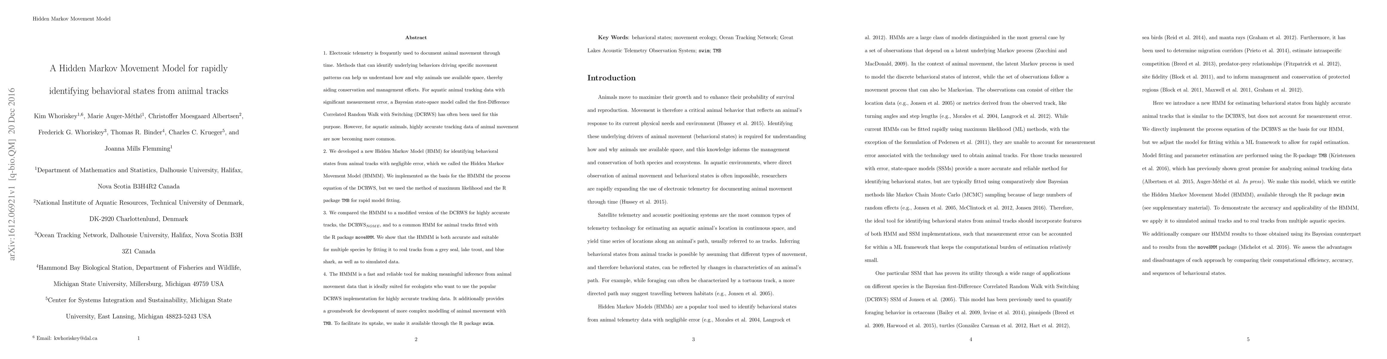 The paper introduces a new Hidden Markov Movement Model (HMMM) for identifying behavioral states from highly accurate animal tracks, using maximum likelihood and the R package TMB for efficient fitting. The HMMM outperforms existing models like the DCRWSnome and moveHMM, and is demonstrated to be accurate and versatile across species, making it a valuable tool for ecologists.