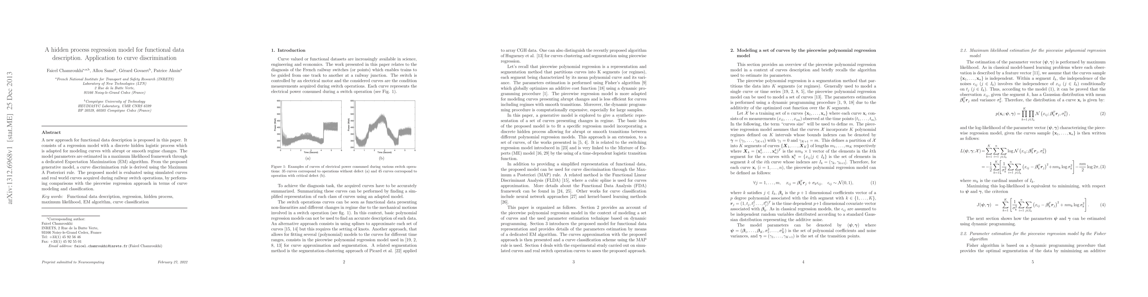 This paper presents a new hidden process regression model for describing functional data, employing a discrete hidden logistic process to model curves with regime changes. The model is estimated via an Expectation Maximization algorithm, and a curve discrimination rule is derived using the Maximum A Posteriori rule. The model's performance is evaluated against piecewise regression on both simulated and real railway switch operation curves.