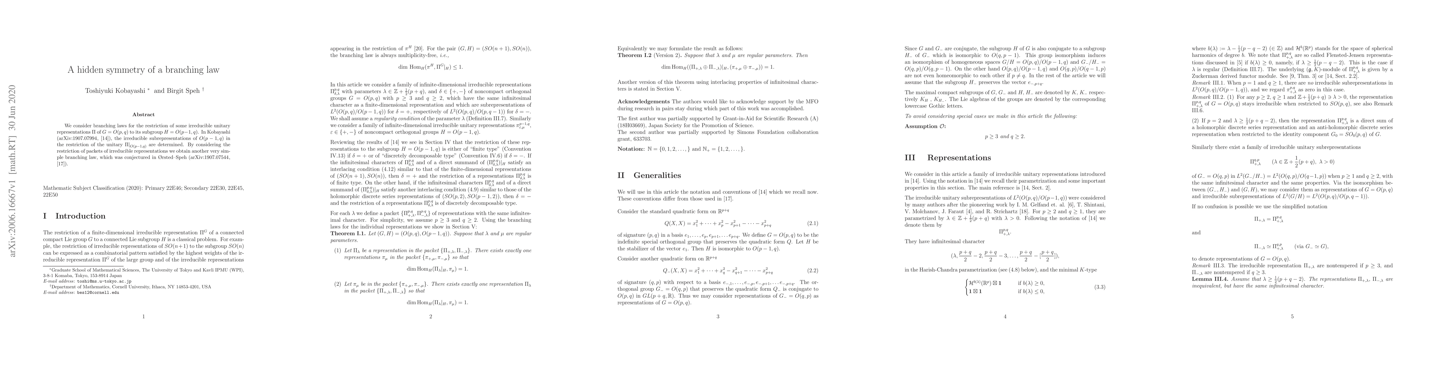 We consider branching laws for the restriction of some irreducible unitary representations $\Pi$ of $G=O(p,q)$ to its subgroup $H=O(p-1,q)$. In Kobayashi (arXiv:1907.07994), the irreducible subrepresentations of $O(p-1,q)$ in the restriction of the unitary $\Pi|_{O(p-1,q) }$ are determined. By considering the restriction of packets of irreducible representations we obtain another very simple branching law, which was conjectured in Orsted-Speh (arXiv:1907.07544).