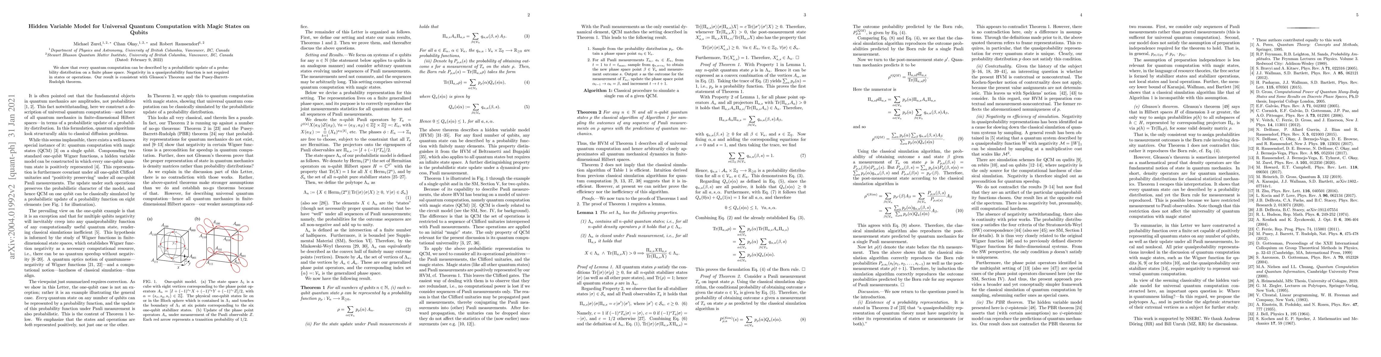Summary: This paper proposes a hidden variable model for universal quantum computation using magic states, demonstrating that quantum computations can be represented by Bayesian updates on a finite state space, with the state space size dependent only on the number of magic states, not the computation sequence length.