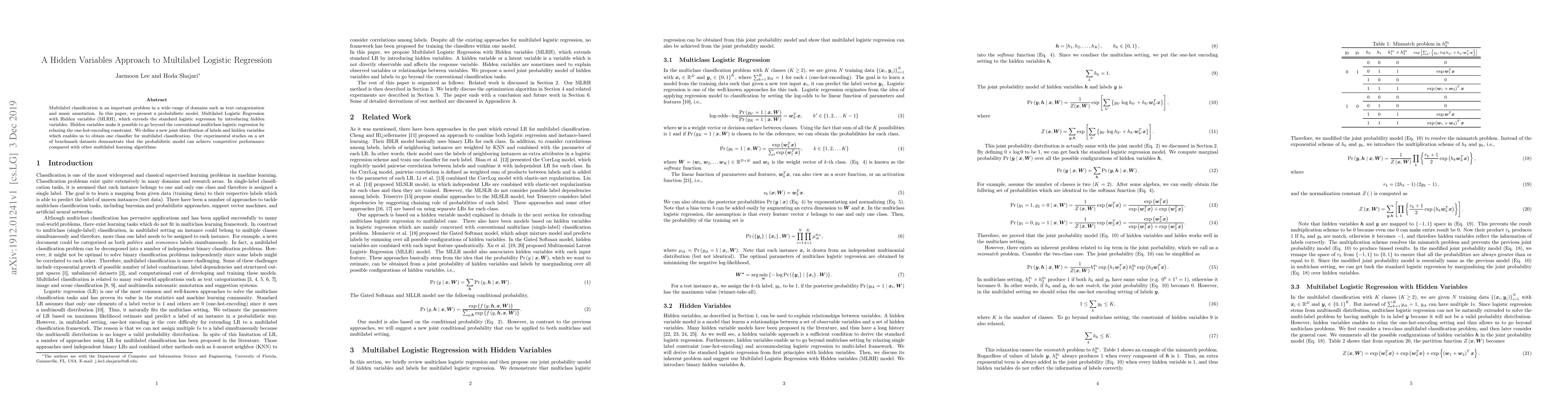 This paper introduces a probabilistic model called Multilabel Logistic Regression with Hidden variables (MLRH) that extends standard logistic regression by incorporating hidden variables to relax the one-hot-encoding constraint, achieving competitive performance on benchmark datasets for multilabel classification tasks.