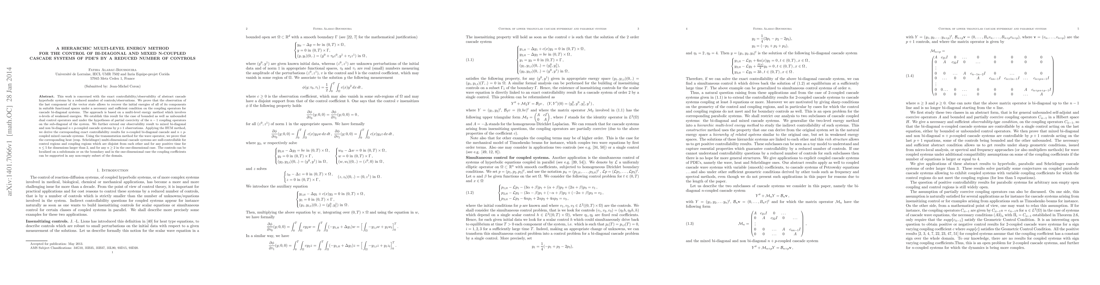 This paper develops a multi-level energy method for controlling bi-diagonal and mixed cascade systems of PDEs with fewer controls. It establishes observability and exact controllability under specific conditions, extending results to mixed systems and proving null-controllability for multi-dimensional cascade systems.