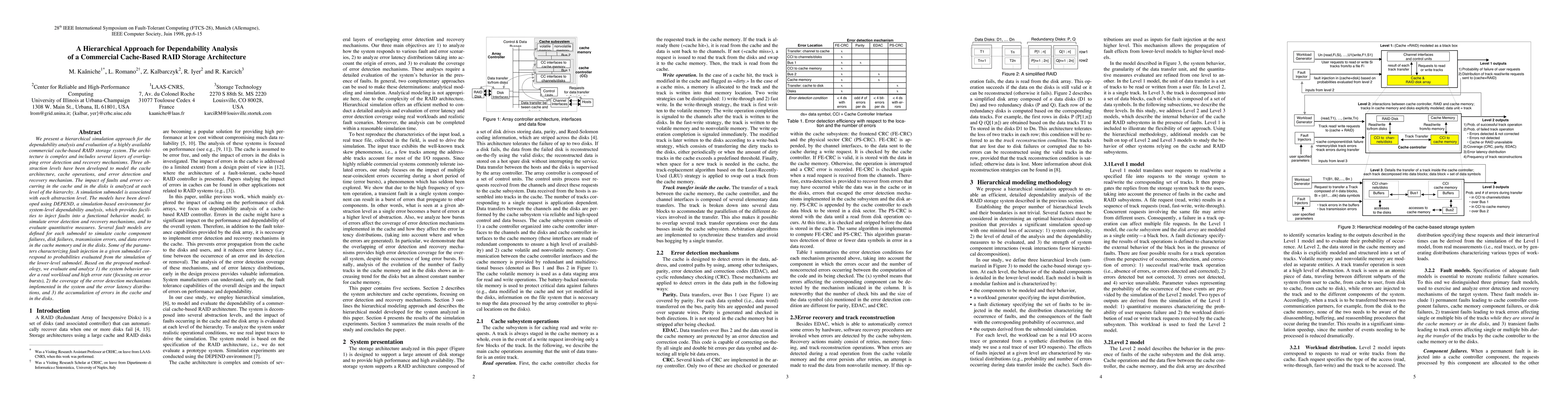 We present a hierarchical simulation approach for the dependability analysis and evaluation of a highly available commercial cache-based RAID storage system. The archi-tecture is complex and includes several layers of overlap-ping error detection and recovery mechanisms. Three ab-straction levels have been developed to model the cache architecture, cache operations, and error detection and recovery mechanism. The impact of faults and errors oc-curring in the cache and in the disks is analyzed at each level of the hierarchy. A simulation submodel is associated with each abstraction level. The models have been devel-oped using DEPEND, a simulation-based environment for system-level dependability analysis, which provides facili-ties to inject faults into a functional behavior model, to simulate error detection and recovery mechanisms, and to evaluate quantitative measures. Several fault models are defined for each submodel to simulate cache component failures, disk failures, transmission errors, and data errors in the cache memory and in the disks. Some of the parame-ters characterizing fault injection in a given submodel cor-respond to probabilities evaluated from the simulation of the lower-level submodel. Based on the proposed method-ology, we evaluate and analyze 1) the system behavior un-der a real workload and high error rate (focusing on error bursts), 2) the coverage of the error detection mechanisms implemented in the system and the error latency distribu-tions, and 3) the accumulation of errors in the cache and in the disks.
