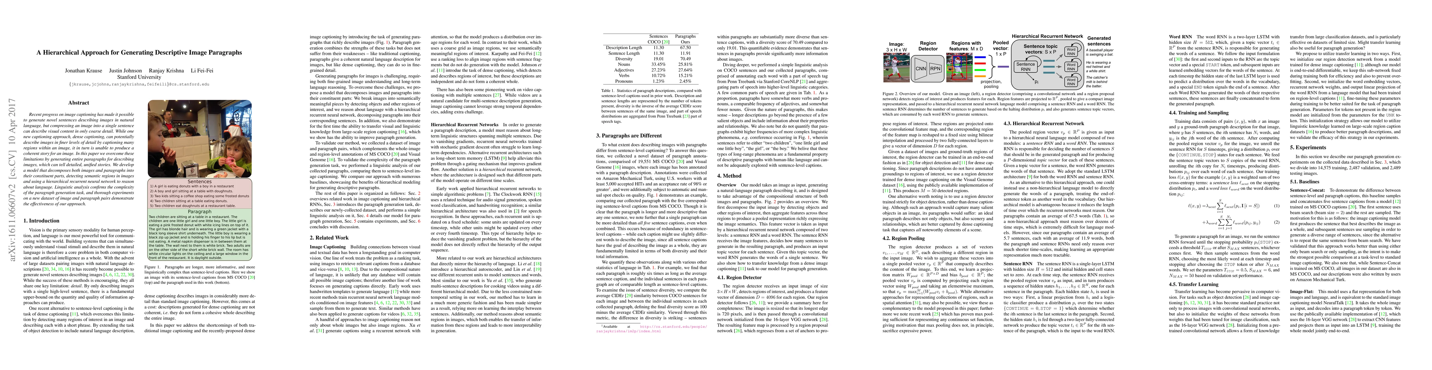 Recent progress on image captioning has made it possible to generate novel sentences describing images in natural language, but compressing an image into a single sentence can describe visual content in only coarse detail. While one new captioning approach, dense captioning, can potentially describe images in finer levels of detail by captioning many regions within an image, it in turn is unable to produce a coherent story for an image. In this paper we overcome these limitations by generating entire paragraphs for describing images, which can tell detailed, unified stories. We develop a model that decomposes both images and paragraphs into their constituent parts, detecting semantic regions in images and using a hierarchical recurrent neural network to reason about language. Linguistic analysis confirms the complexity of the paragraph generation task, and thorough experiments on a new dataset of image and paragraph pairs demonstrate the effectiveness of our approach.