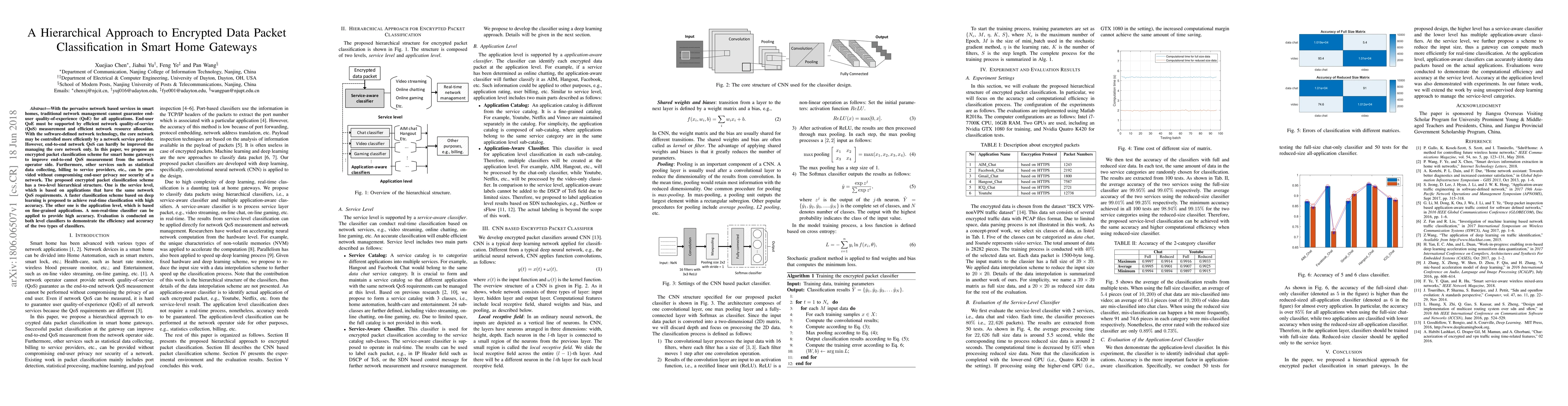 With the pervasive network based services in smart homes, traditional network management cannot guarantee end-user quality-of-experience (QoE) for all applications. End-user QoE must be supported by efficient network quality-of-service (QoS) measurement and efficient network resource allocation. With the software-defined network technology, the core network may be controlled more efficiently by a network service provider. However, end-to-end network QoS can hardly be improved the managing the core network only. In this paper, we propose an encrypted packet classification scheme for smart home gateways to improve end-to-end QoS measurement from the network operator side. Furthermore, other services such as statistical data collecting, billing to service providers, etc., can be provided without compromising end-user privacy nor security of a network. The proposed encrypted packet classification scheme has a two-level hierarchical structure. One is the service level, which is based on applications that have the same network QoS requirements. A faster classification scheme based on deep learning is proposed to achieve real-time classification with high accuracy. The other one is the application level, which is based on fine-grained applications. A non-real-time classifier can be applied to provide high accuracy. Evaluation is conducted on both level classifiers to demonstrate the efficiency and accuracy of the two types of classifiers.