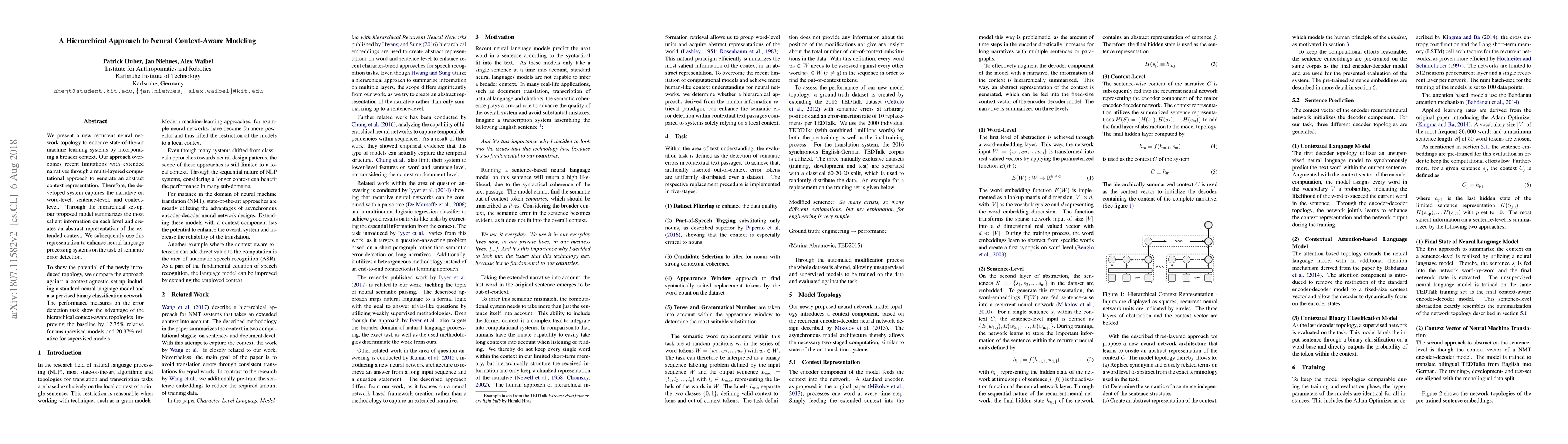 We present a new recurrent neural network topology to enhance state-of-the-art machine learning systems by incorporating a broader context. Our approach overcomes recent limitations with extended narratives through a multi-layered computational approach to generate an abstract context representation. Therefore, the developed system captures the narrative on word-level, sentence-level, and context-level. Through the hierarchical set-up, our proposed model summarizes the most salient information on each level and creates an abstract representation of the extended context. We subsequently use this representation to enhance neural language processing systems on the task of semantic error detection. To show the potential of the newly introduced topology, we compare the approach against a context-agnostic set-up including a standard neural language model and a supervised binary classification network. The performance measures on the error detection task show the advantage of the hierarchical context-aware topologies, improving the baseline by 12.75% relative for unsupervised models and 20.37% relative for supervised models.