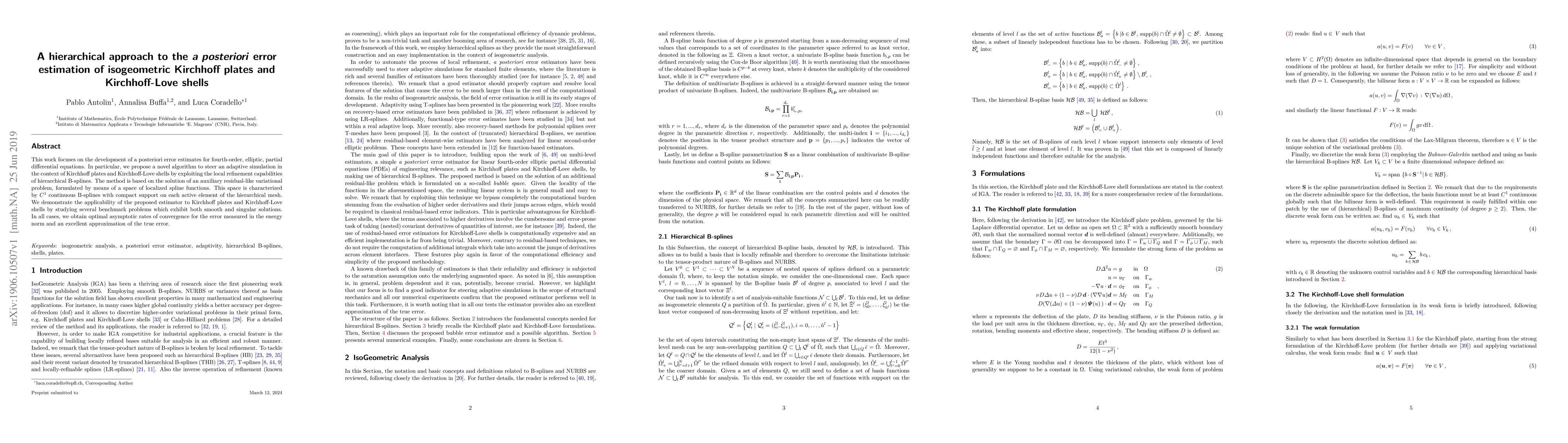 This paper develops a posteriori error estimates for fourth-order elliptic PDEs using hierarchical B-splines for adaptive simulation of Kirchhoff plates and shells. The proposed method achieves optimal convergence rates and accurately approximates true errors through localized spline functions.