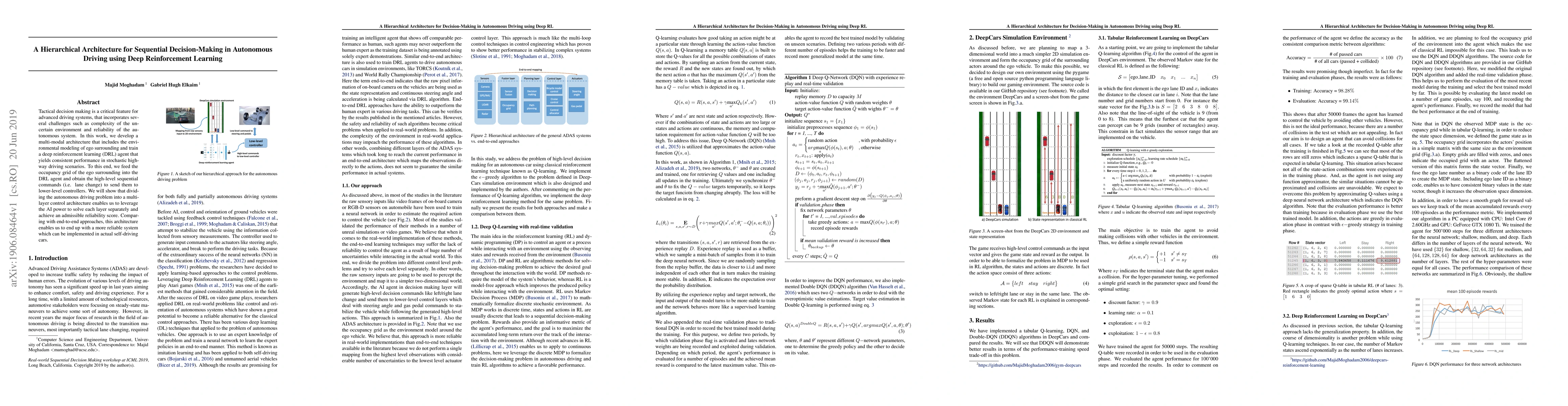 This research introduces a hierarchical deep reinforcement learning (DRL) architecture for autonomous driving, addressing tactical decision-making challenges. By dividing the problem into multi-layer controls, the system demonstrates consistent performance in stochastic highway scenarios, offering improved reliability over end-to-end approaches for practical self-driving car implementation.