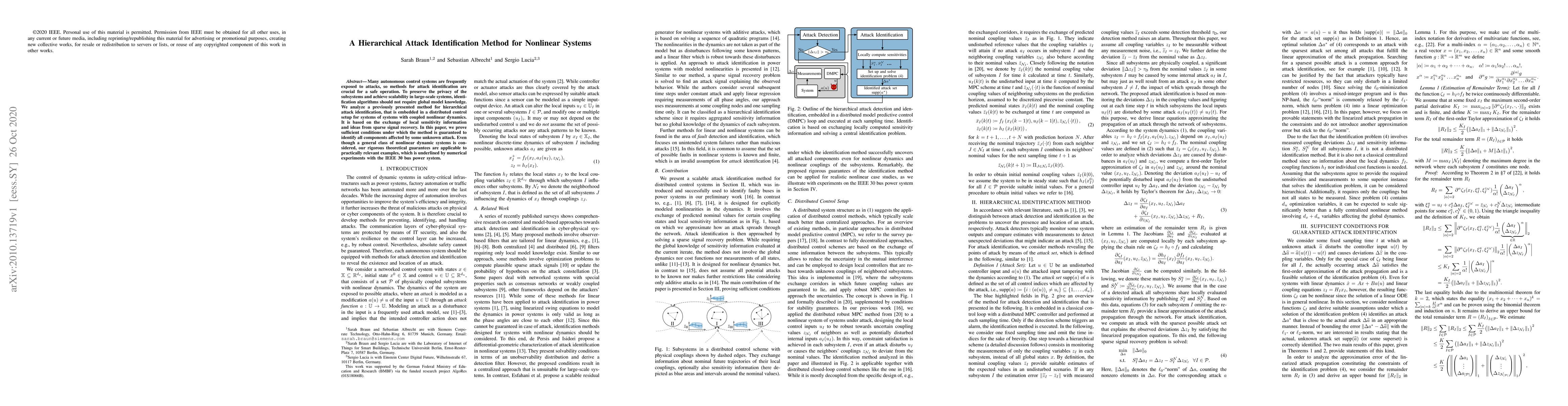 This paper presents a hierarchical attack identification method for nonlinear systems that operates without requiring global model knowledge, relying on local sensitivity information and sparse signal recovery. The method is theoretically proven to identify all components affected by unknown attacks, validated through numerical experiments on the IEEE 30 bus power system.