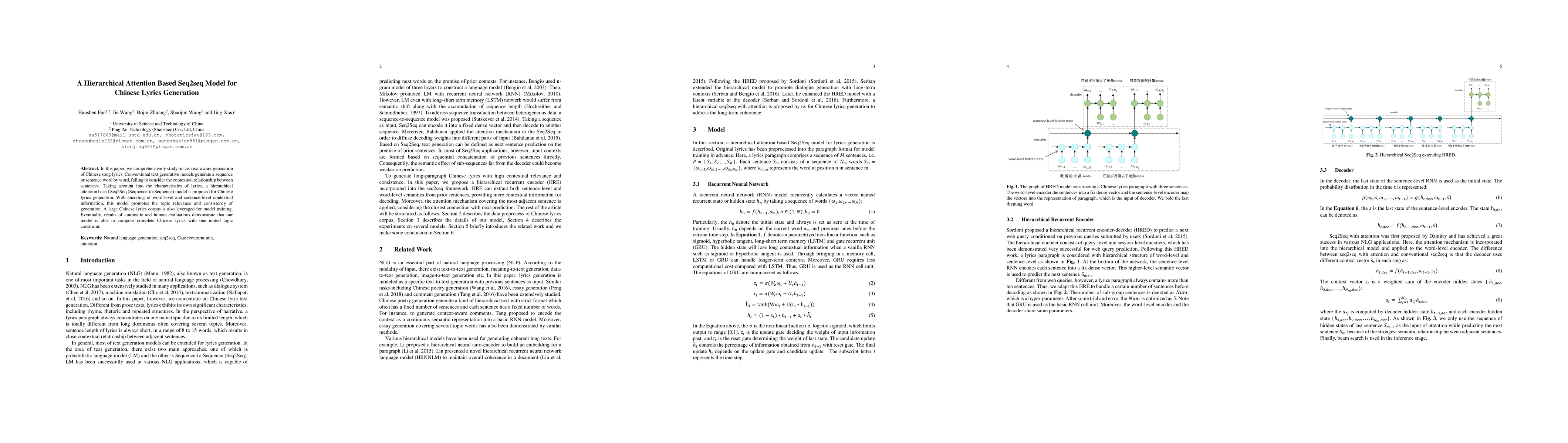 This paper proposes a hierarchical attention-based Seq2Seq model for generating context-aware Chinese song lyrics, addressing the limitations of conventional models by encoding word-level and sentence-level contextual information. Evaluations show the model effectively produces coherent lyrics with a unified topic.