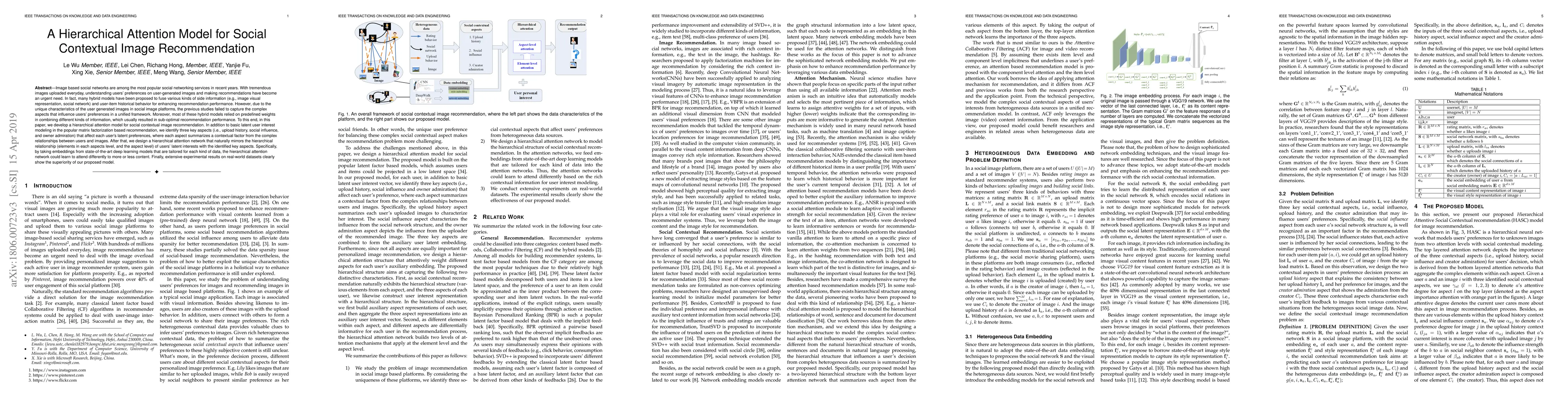 This paper proposes a hierarchical attention model for social contextual image recommendation that captures complex user preferences by integrating upload history, social influence, and owner admiration. The model employs a hierarchical attention network to better combine different contextual factors, outperforming traditional hybrid models.