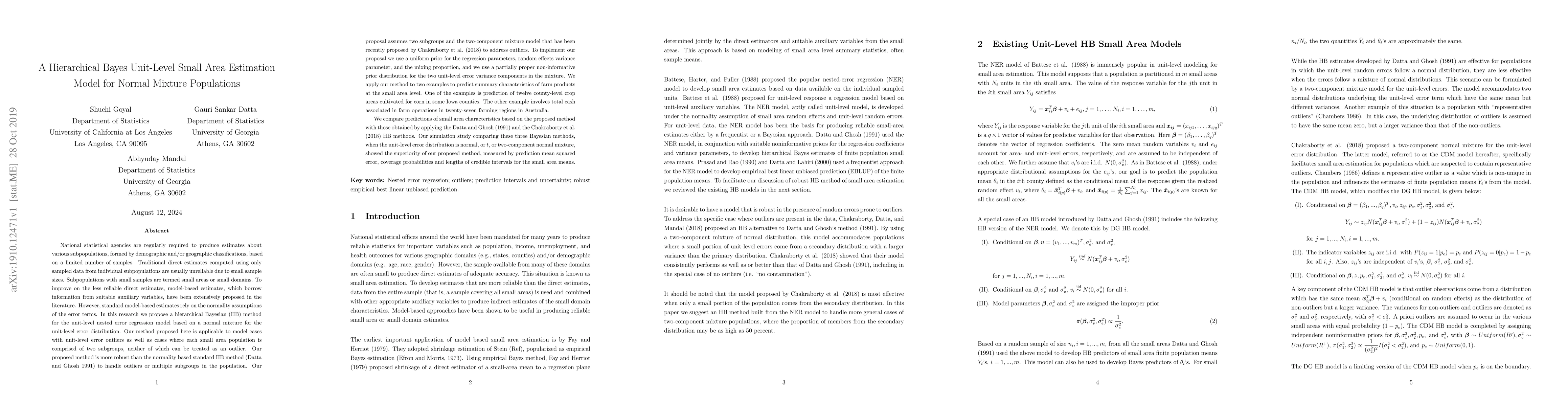 National statistical agencies are regularly required to produce estimates about various subpopulations, formed by demographic and/or geographic classifications, based on a limited number of samples. Traditional direct estimates computed using only sampled data from individual subpopulations are usually unreliable due to small sample sizes. Subpopulations with small samples are termed small areas or small domains. To improve on the less reliable direct estimates, model-based estimates, which borrow information from suitable auxiliary variables, have been extensively proposed in the literature. However, standard model-based estimates rely on the normality assumptions of the error terms. In this research we propose a hierarchical Bayesian (HB) method for the unit-level nested error regression model based on a normal mixture for the unit-level error distribution. To implement our proposal we use a uniform prior for the regression parameters, random effects variance parameter, and the mixing proportion, and we use a partially proper non-informative prior distribution for the two unit-level error variance components in the mixture. We apply our method to two examples to predict summary characteristics of farm products at the small area level. One of the examples is prediction of twelve county-level crop areas cultivated for corn in some Iowa counties. The other example involves total cash associated in farm operations in twenty-seven farming regions in Australia. We compare predictions of small area characteristics based on the proposed method with those obtained by applying the Datta and Ghosh (1991) and the Chakraborty et al. (2018) HB methods. Our simulation study comparing these three Bayesian methods showed the superiority of our proposed method, measured by prediction mean squared error, coverage probabilities and lengths of credible intervals for the small area means.