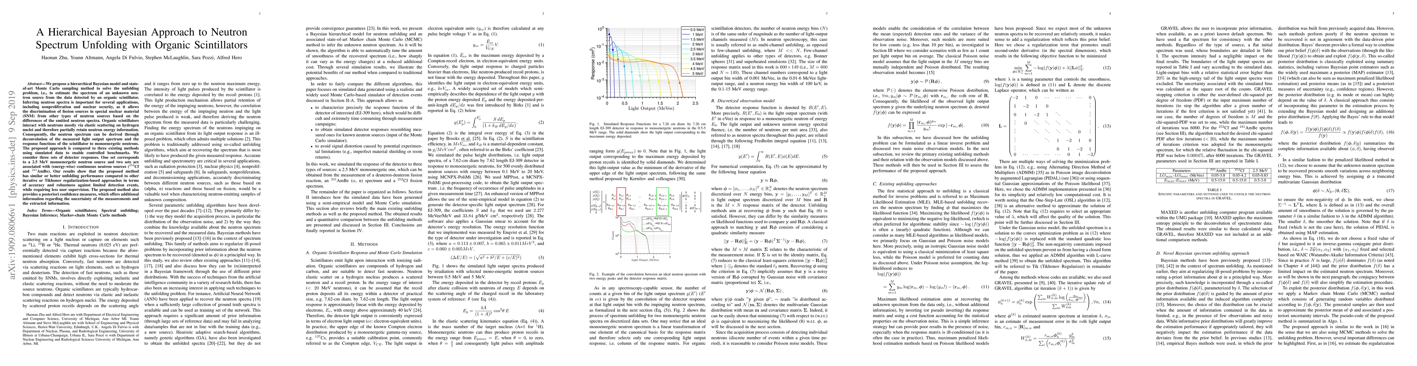 This paper proposes a hierarchical Bayesian model combined with Monte Carlo sampling to estimate neutron spectra from organic scintillator data, crucial for applications like nuclear security. The method shows comparable or superior performance to existing techniques, offering better accuracy, robustness, and user-independence, along with confidence measures for measurement uncertainties.