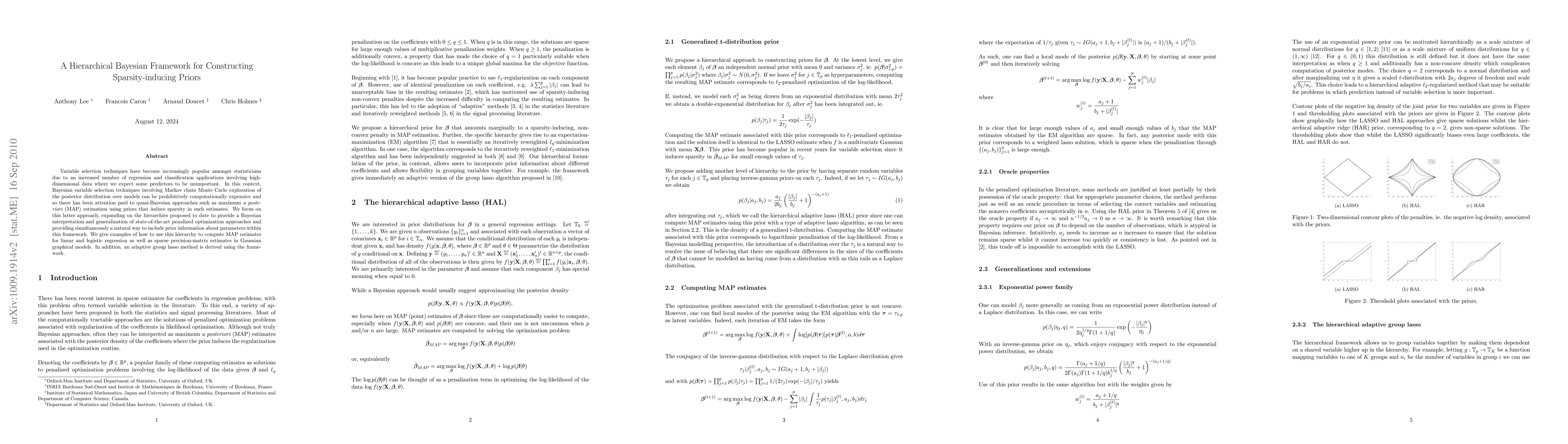 Variable selection techniques have become increasingly popular amongst statisticians due to an increased number of regression and classification applications involving high-dimensional data where we expect some predictors to be unimportant. In this context, Bayesian variable selection techniques involving Markov chain Monte Carlo exploration of the posterior distribution over models can be prohibitively computationally expensive and so there has been attention paid to quasi-Bayesian approaches such as maximum a posteriori (MAP) estimation using priors that induce sparsity in such estimates. We focus on this latter approach, expanding on the hierarchies proposed to date to provide a Bayesian interpretation and generalization of state-of-the-art penalized optimization approaches and providing simultaneously a natural way to include prior information about parameters within this framework. We give examples of how to use this hierarchy to compute MAP estimates for linear and logistic regression as well as sparse precision-matrix estimates in Gaussian graphical models. In addition, an adaptive group lasso method is derived using the framework.