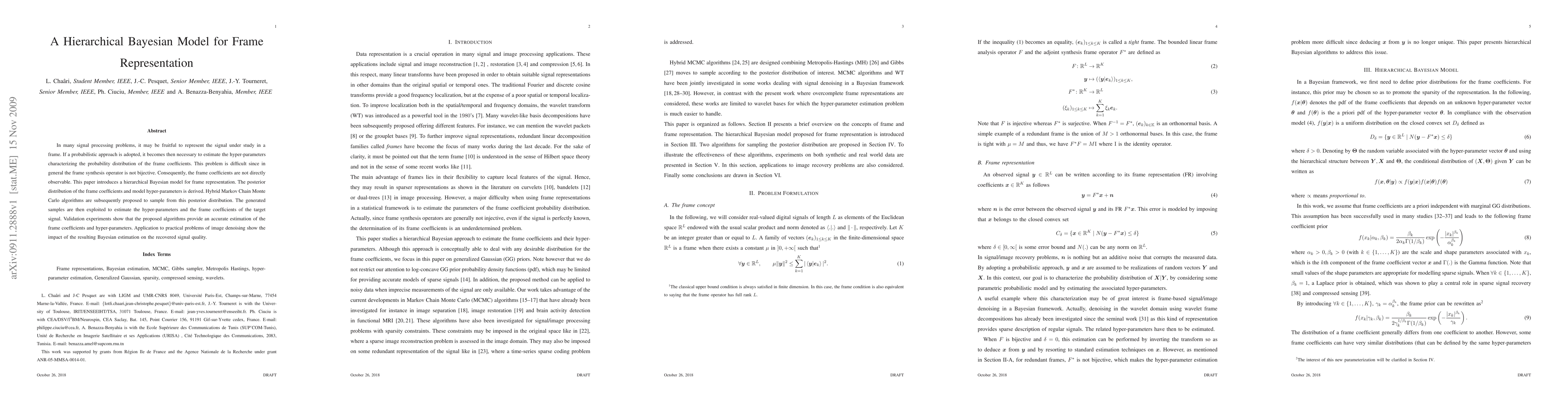 A new Bayesian model is introduced to estimate frame representation in signal processing, allowing for accurate estimation of hyper-parameters and frame coefficients with hybrid Markov Chain Monte Carlo algorithms.