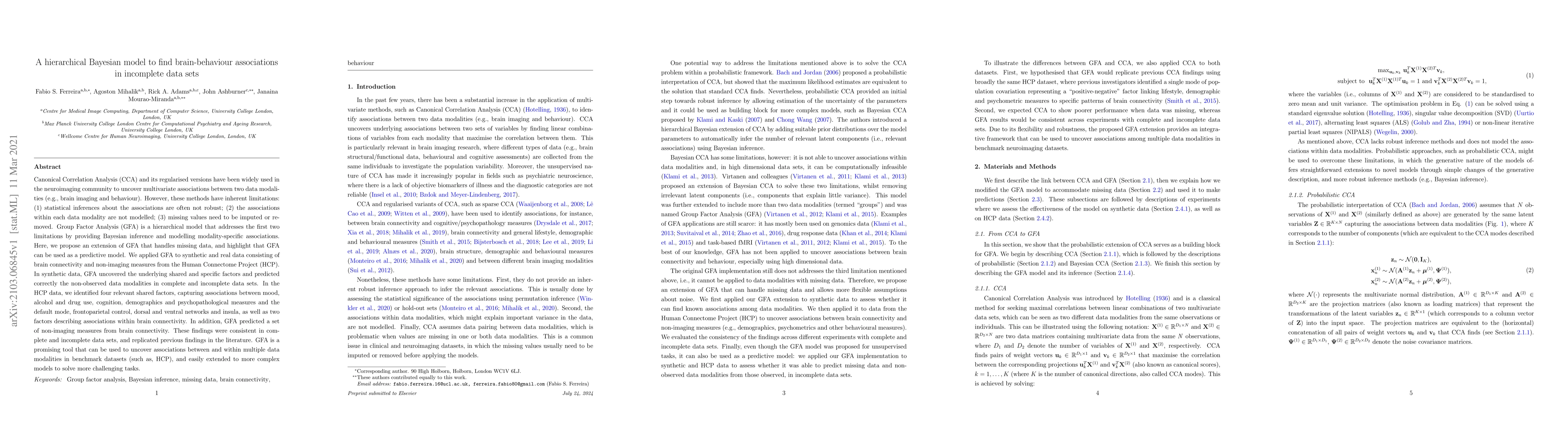 This paper proposes an extension of Group Factor Analysis (GFA) to handle missing data, demonstrating its effectiveness in uncovering brain-behaviour associations using a hierarchical Bayesian model. The method successfully identifies shared and specific factors in both synthetic and real Human Connectome Project data, showing robust predictions even in incomplete datasets.