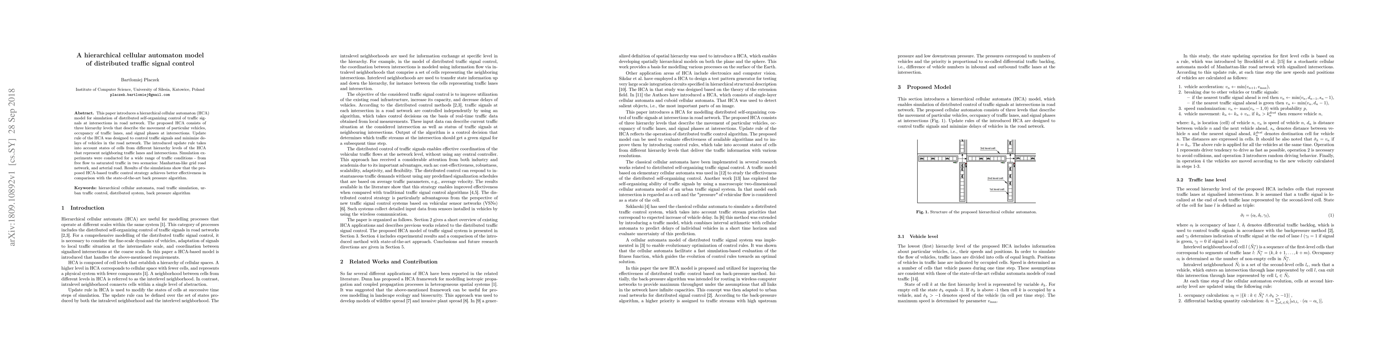 This paper proposes a hierarchical cellular automaton model for distributed traffic signal control, demonstrating improved effectiveness over the state-of-the-art back pressure algorithm through simulations in various traffic conditions. The model consists of three hierarchy levels to manage vehicle movement, lane occupancy, and signal phases.