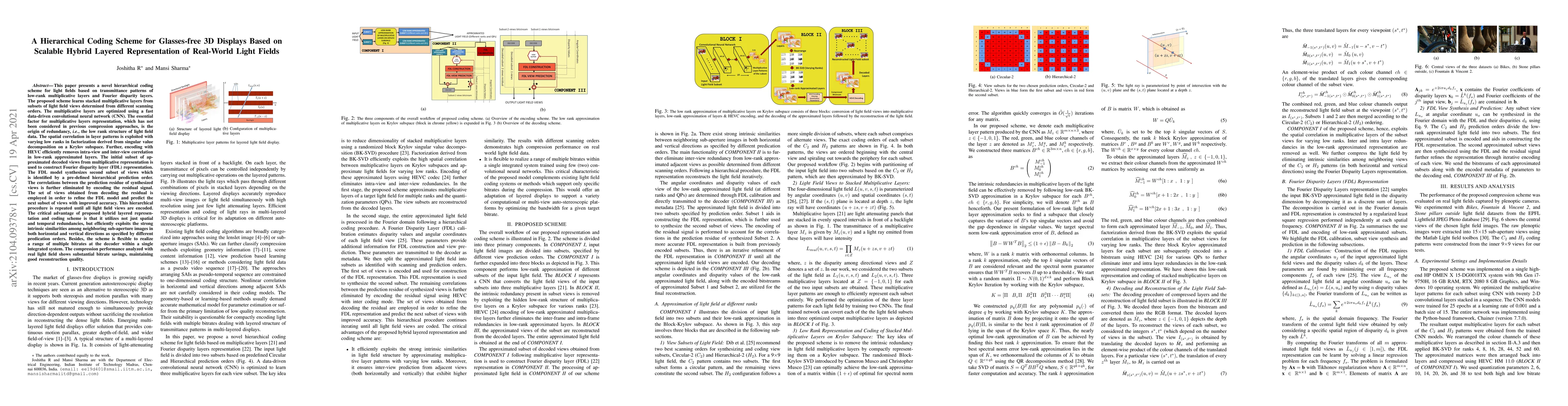 A novel hierarchical coding scheme for glasses-free 3D displays is proposed, leveraging transmittance patterns of low-rank multiplicative layers and Fourier disparity layers to achieve substantial bitrate savings while maintaining reconstruction quality.