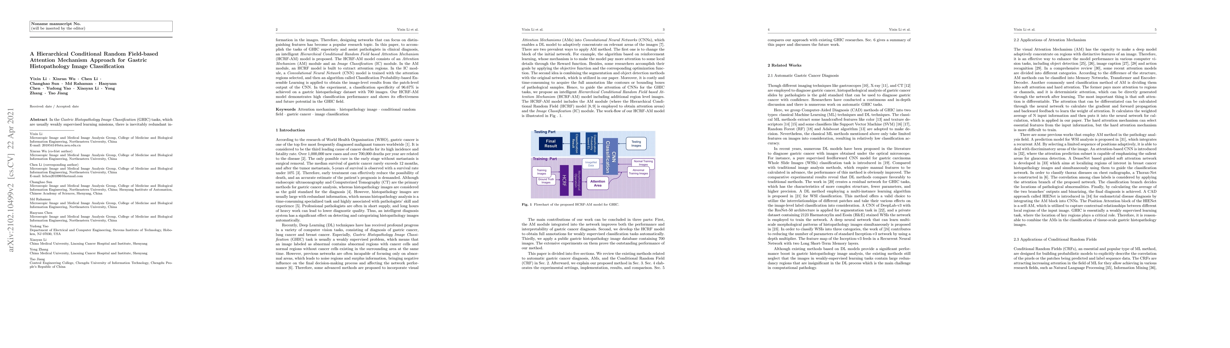 This paper proposes a Hierarchical Conditional Random Field-based Attention Mechanism (HCRF-AM) model for Gastric Histopathology Image Classification (GHIC). The model combines an Attention Mechanism to extract relevant regions and a Convolutional Neural Network for classification, achieving a specificity of 96.67% on a dataset of 700 images.
