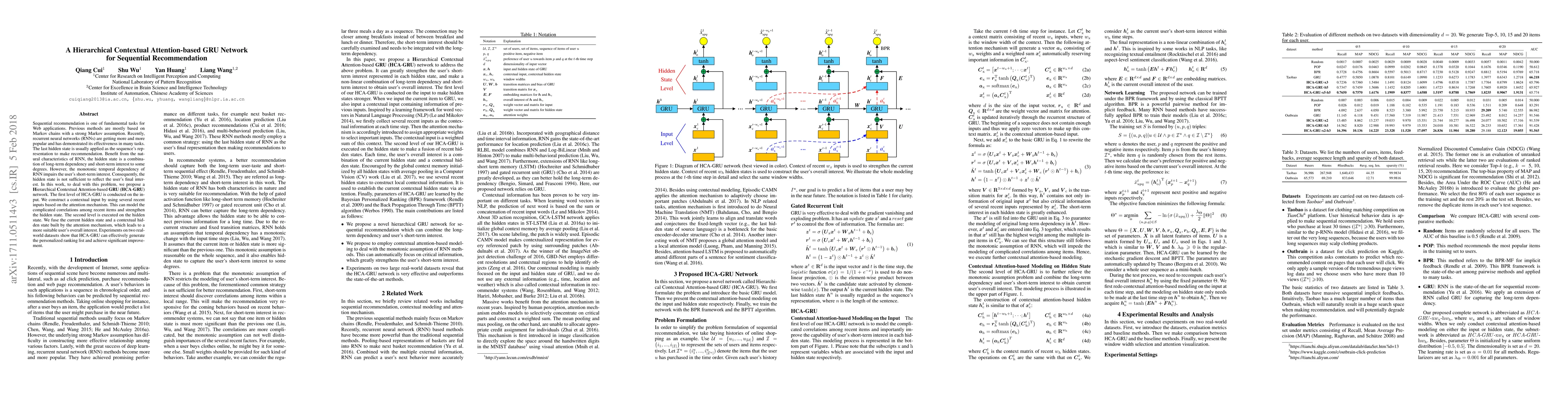 This paper proposes a Hierarchical Contextual Attention-based GRU (HCA-GRU) network to enhance sequential recommendation by addressing the limitations of RNNs in capturing short-term user interests. It employs attention mechanisms to refine both input and hidden states, achieving significant improvements in personalized ranking.
