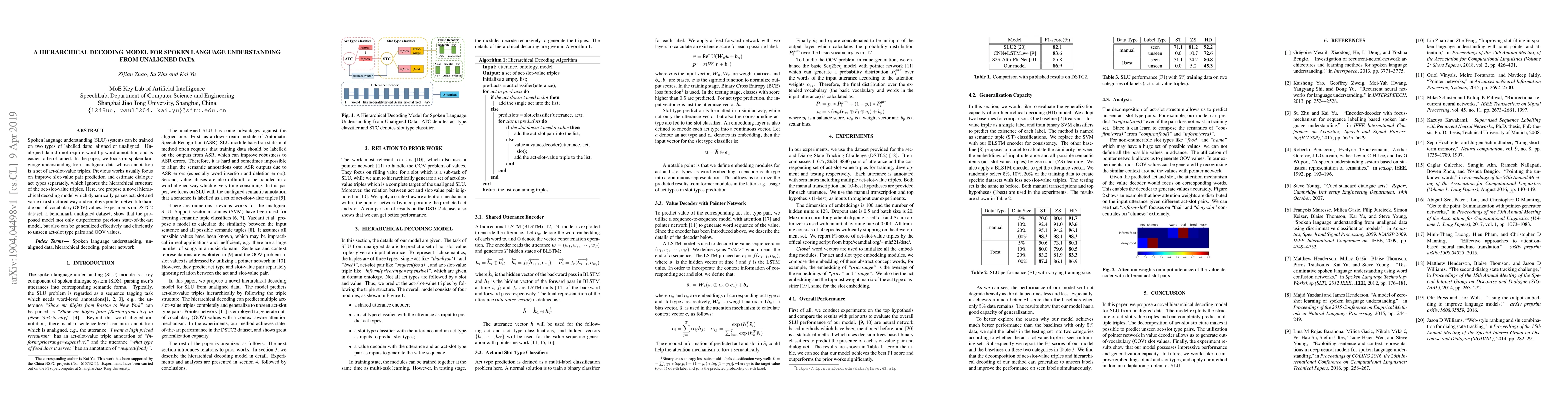 This paper proposes a hierarchical decoding model for spoken language understanding from unaligned data, focusing on act-slot-value triples. The model dynamically parses the hierarchical structure and uses a pointer network to handle out-of-vocabulary values, outperforming previous methods on the DSTC2 dataset.