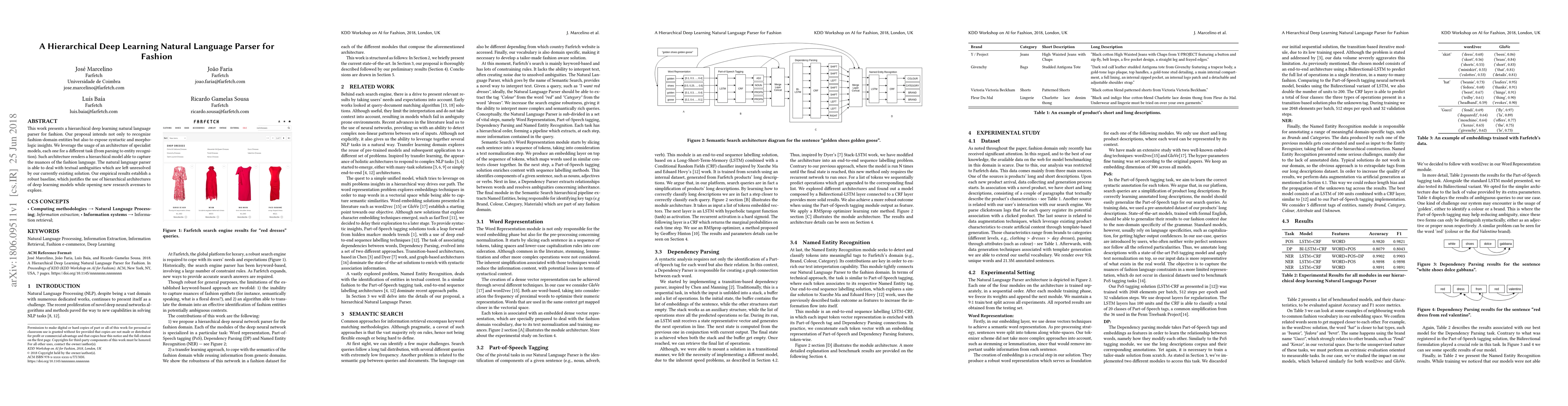 This work presents a hierarchical deep learning natural language parser for fashion. Our proposal intends not only to recognize fashion-domain entities but also to expose syntactic and morphologic insights. We leverage the usage of an architecture of specialist models, each one for a different task (from parsing to entity recognition). Such architecture renders a hierarchical model able to capture the nuances of the fashion language. The natural language parser is able to deal with textual ambiguities which are left unresolved by our currently existing solution. Our empirical results establish a robust baseline, which justifies the use of hierarchical architectures of deep learning models while opening new research avenues to explore.