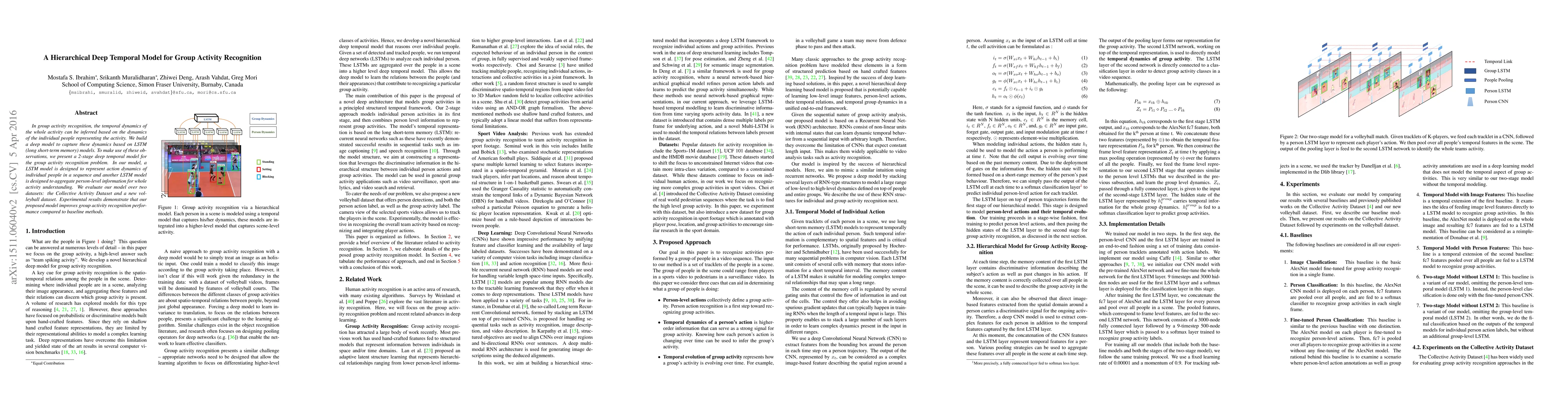 This paper proposes a hierarchical deep temporal model using LSTM networks for group activity recognition, consisting of individual and aggregated LSTM layers to capture and synthesize action dynamics. Experimental results show improved performance over baseline methods on two datasets.