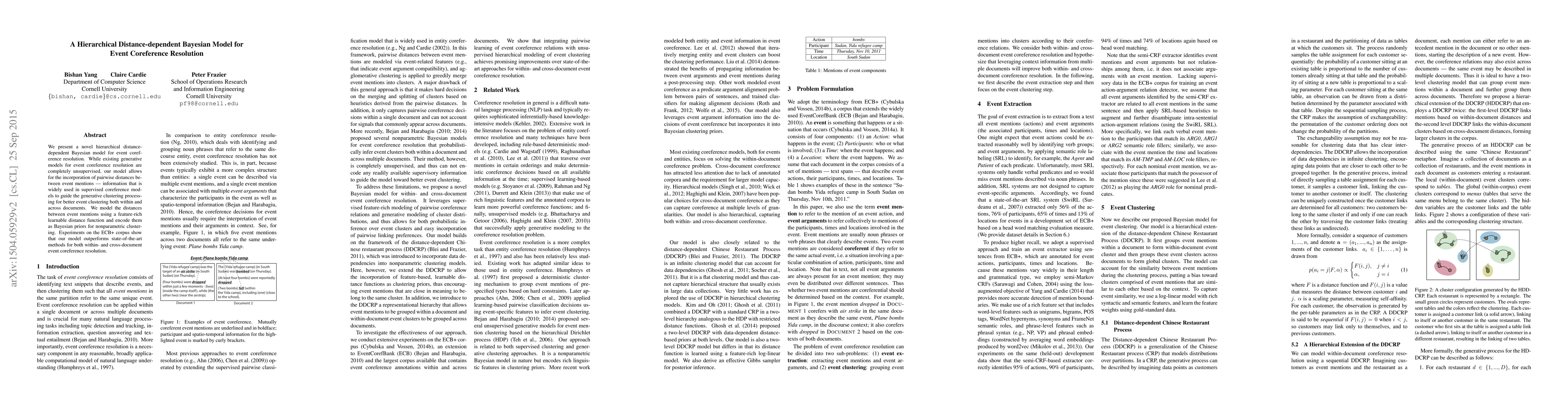 This paper introduces a hierarchical distance-dependent Bayesian model for event coreference resolution, incorporating pairwise distances between event mentions to enhance clustering. The model outperforms existing methods, demonstrating superior performance in both within- and cross-document event coreference resolution.