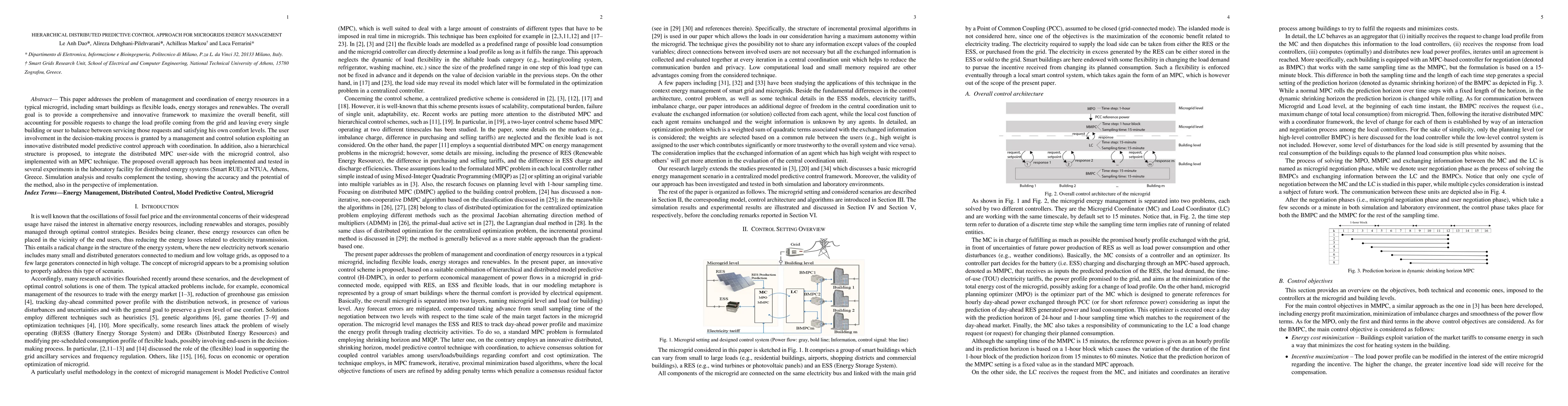 This paper proposes a hierarchical distributed predictive control approach for managing microgrid energy resources, integrating smart buildings, energy storages, and renewables. The framework maximizes benefits while accommodating grid requests and user comfort, validated through lab experiments and simulations at NTUA, Athens.