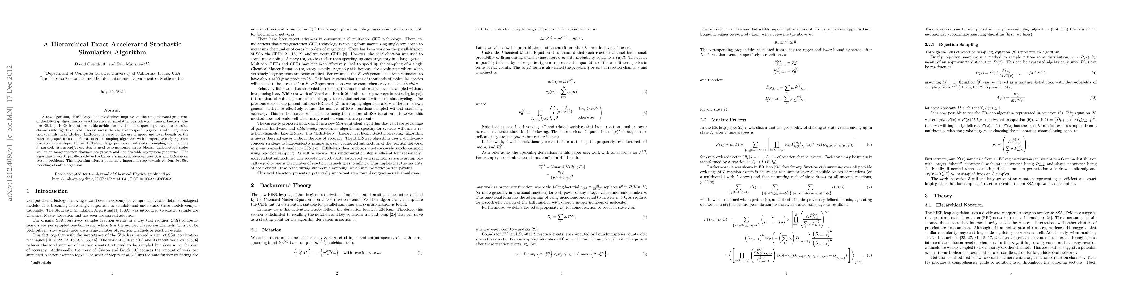 A new algorithm, "HiER-leap", is derived which improves on the computational properties of the ER-leap algorithm for exact accelerated simulation of stochastic chemical kinetics. Unlike ER-leap, HiER-leap utilizes a hierarchical or divide-and-conquer organization of reaction channels into tightly coupled "blocks" and is thereby able to speed up systems with many reaction channels. Like ER-leap, HiER-leap is based on the use of upper and lower bounds on the reaction propensities to define a rejection sampling algorithm with inexpensive early rejection and acceptance steps. But in HiER-leap, large portions of intra-block sampling may be done in parallel. An accept/reject step is used to synchronize across blocks. This method scales well when many reaction channels are present and has desirable asymptotic properties. The algorithm is exact, parallelizable and achieves a significant speedup over SSA and ER-leap on certain problems. This algorithm offers a potentially important step towards efficient in silico modeling of entire organisms.