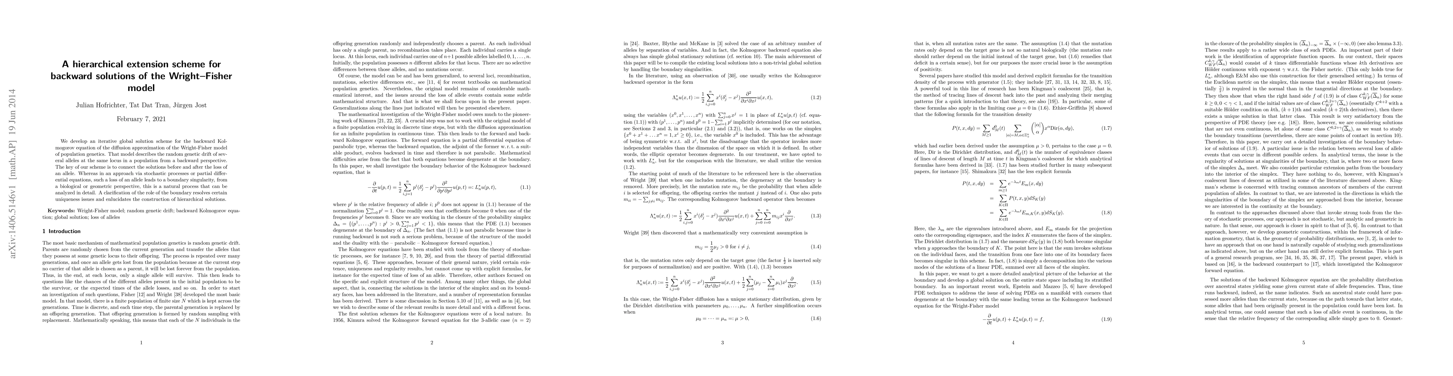 We develop an iterative global solution scheme for the backward Kolmogorov equation of the diffusion approximation of the Wright-Fisher model of population genetics. That model describes the random genetic drift of several alleles at the same locus in a population from a backward perspective. The key of our scheme is to connect the solutions before and after the loss of an allele. Whereas in an approach via stochastic processes or partial differential equations, such a loss of an allele leads to a boundary singularity, from a biological or geometric perspective, this is a natural process that can be analyzed in detail. A clarification of the role of the boundary resolves certain uniqueness issues and enlucidates the construction of hierarchical solutions.