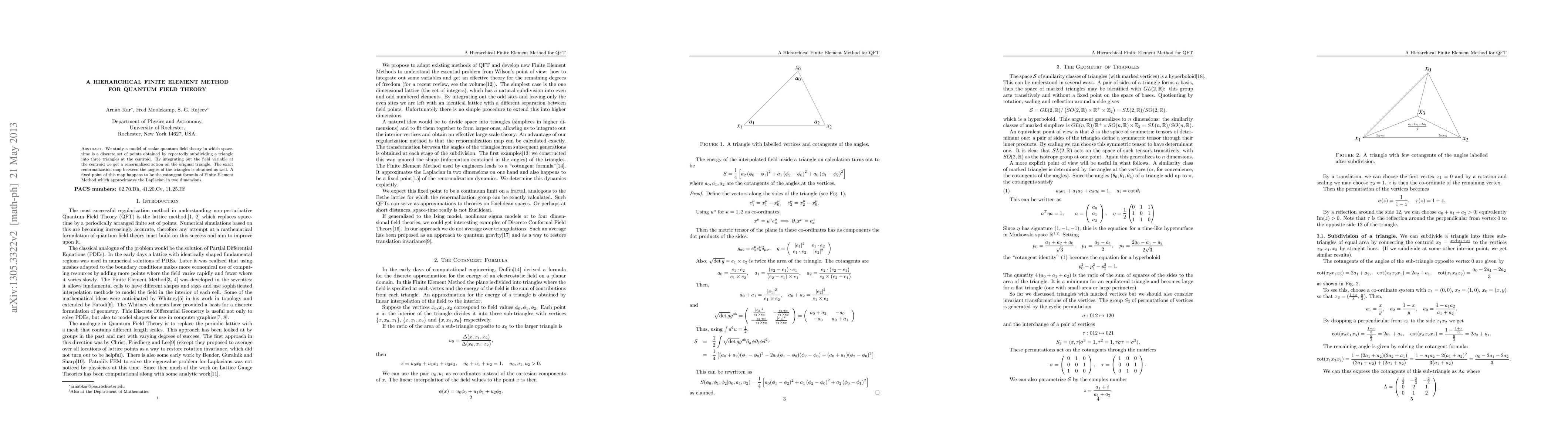 We study a model of scalar quantum field theory in which space-time is a discrete set of points obtained by repeatedly subdividing a triangle into three triangles at the centroid. By integrating out the field variable at the centroid we get a renormalized action on the original triangle. The exact renormalization map between the angles of the triangles is obtained as well. A fixed point of this map happens to be the cotangent formula of Finite Element Method which approximates the Laplacian in two dimensions.